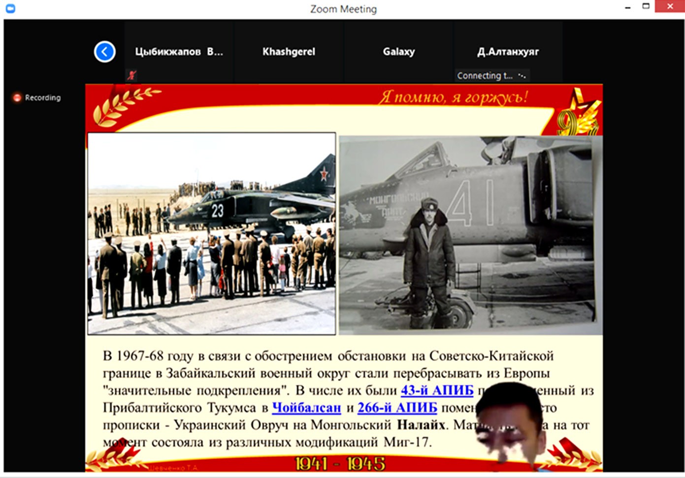Ахмад Э.Мөнх-Эрдэнэ тавьсан илтгэлдээ “Монгол ард” нисэх эскадриль нь дайны дараах жилүүдэд Герман, Унгар, Чехословак, Азербайджан, Украйн, Монгол зэрэг улсуудад шилжин байрлаж, 1945-2014 оны хооронд олон удаа бүтэц, зохион байгуулалтын өөрчлөлтөд орсон. Энэ хугацаанд тус нисэх эскадрилийн бүрэлдэхүүн Ла-7, Ла-9, МиГ-15, МиГ-17, МиГ-21ПФ, МиГ-21ПФМ, МиГ-21БИС, МиГ-23БМ (МиГ-27), Су-25 зэрэг онгоцнуудыг чадварлагаар эзэмшжээ. Монгол Улсад 1968-1990 онуудад “Монгол ард” хэмээх улаан бичигтэй МиГ-17, МиГ-21, МиГ-27К онгоцнуудаар нисэж байсан зэрэг олон сонирхолтой баримтыг хөндлөө.