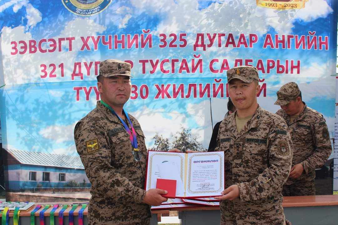 Тэмцээнд оролцож тэргүүлсэн цэргийн алба хаагчдад батламж гардуулсан бол нийлбэр дүнгээр түүхт 30 жилийн ойгоо тэмдэглэж байгаа ахмад Ч.Бумцэнд захирагчтай 321 дүгээр тусгай салбар тэргүүлж Зэвсэгт хүчний 325 дугаар ангийн мэргэжлийн болон нормативын тэргүүлэгч салбараар шалгарлаа.