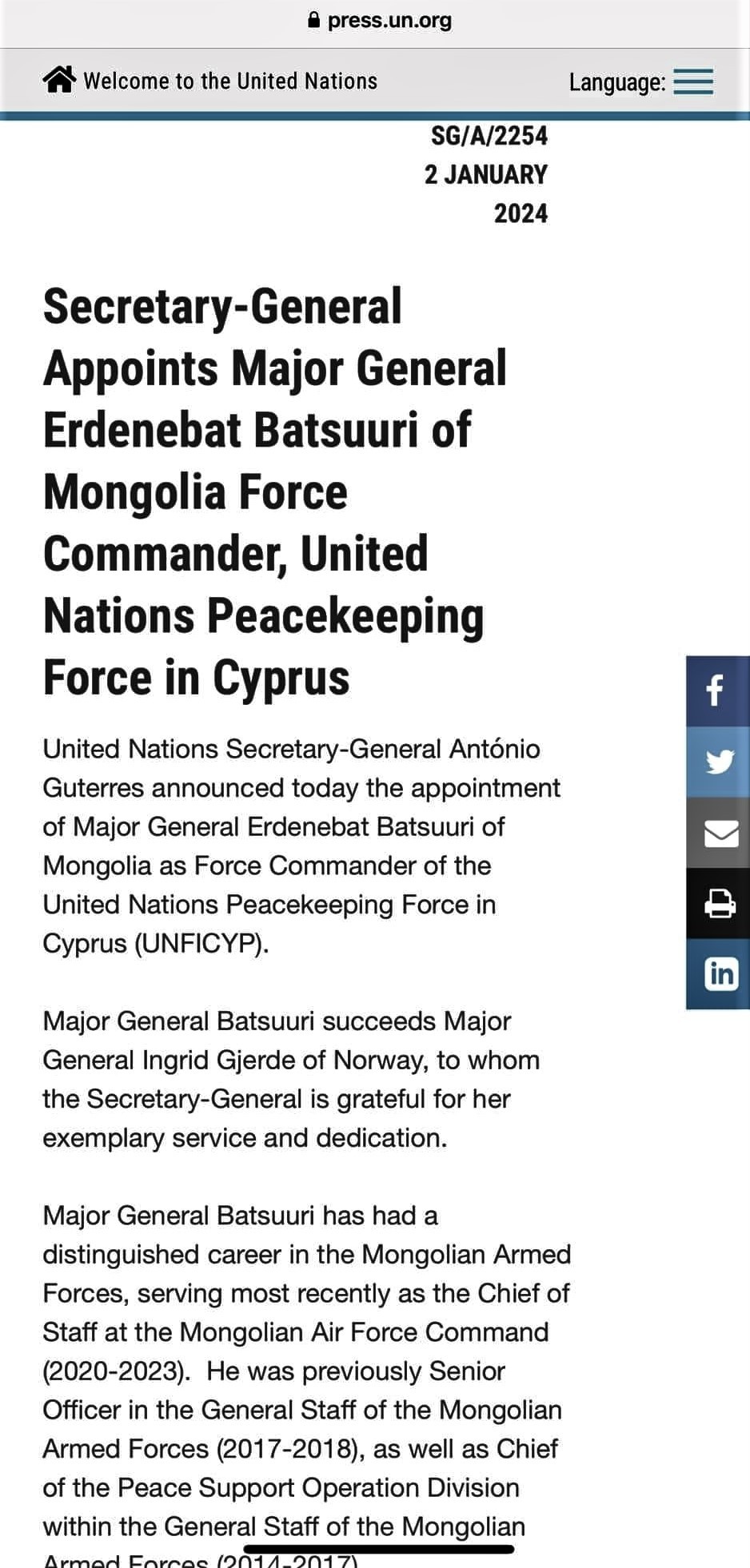 Ийнхүү НҮБ-ын энхийг сахиулах ажиллагаанд үүрэг гүйцэтгэж эхэлсэн цагаас хойш 22 жилийн дараа Бүгд Найрамдах Кипр улс дах НҮБ-ын энхийг сахиулах хүчний командлагчаар Агаарын цэргийн штабын дарга бригадын генерал Б.Эрдэнэбат шалгаран үүрэг гүйцэтгэхээр томилогдож байна.