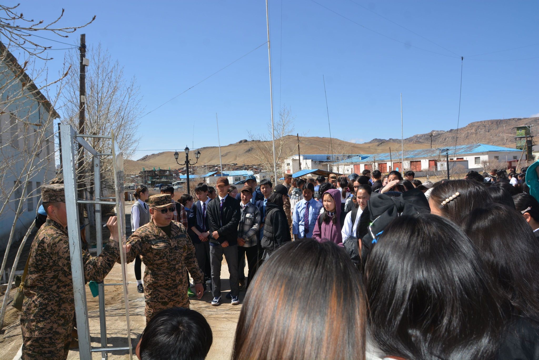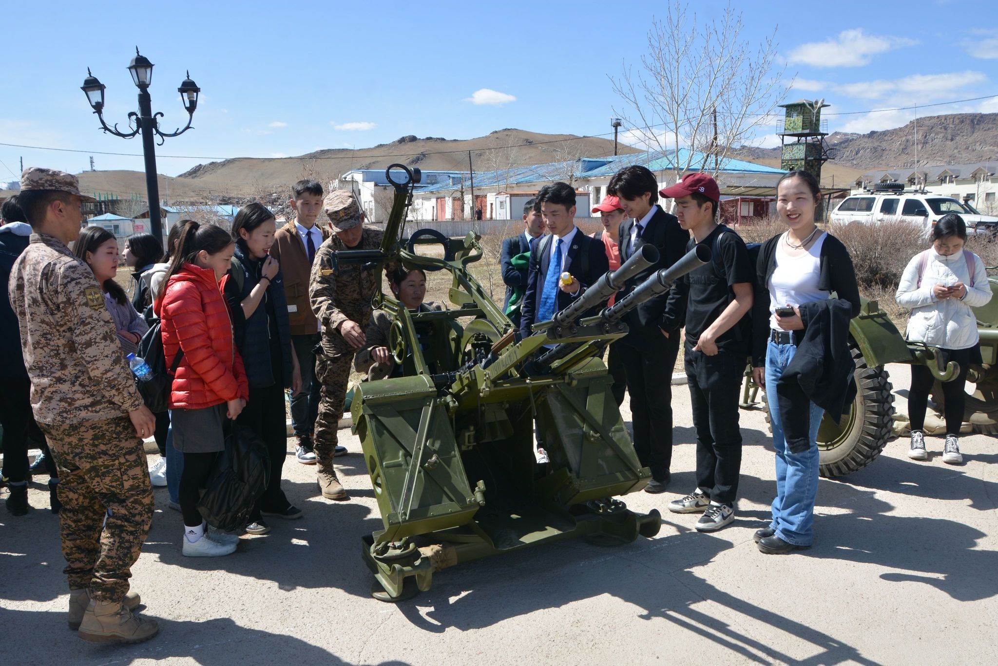 Мөн хорооны командын байрны үйл ажиллагаа болон Р-107 станцыг тохируулж холбоонд орох, 7.62мм АКМ, СВД, 9мм ПМ бууны үүрэг зориулалт, задаргаа, угсаргаа, хүн нэг бүрийн хамгаалах хэрэгсэл Л-1, ДП-5в, ВПХР, МК-3 цацраг хими биологийн тагнуулын багаж, хамгаалах хэрэгсэл, 14.5мм ЗПУ-2 бууны галт байрыг төхөөрөмжилж буудлагад бэлтгэх, НҮБ-ын мандаттай энхийг дэмжих ажиллагаанд үүрэг гүйцэтгэх цэргийн алба хаагчдын шалгуур үзүүлэлт, ажиллагааны өмнөх бэлтгэл, цэргийн авто техник Зил-131, Газ-66 маркийн машин, цэргийн хээрийн гал тогоог хээр хэрхэн дэлгэн байрлуулж ашиглах талаар тухайн албад хариуцсан албан тушаалтнууд багш сурагчдад тус тус танилцууллаа.