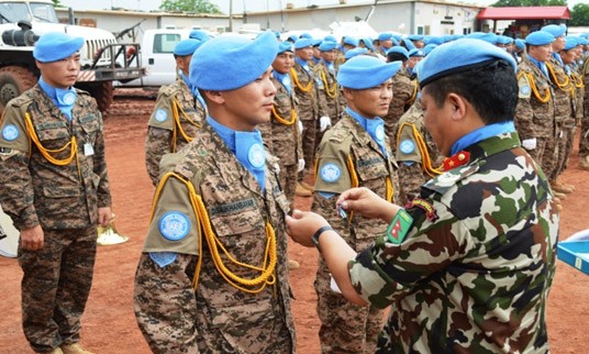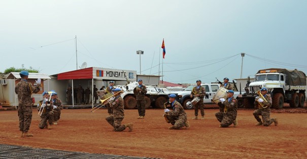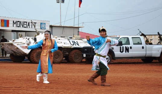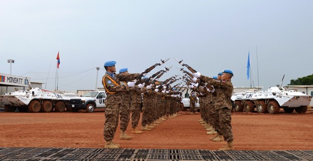 2014оны 07 дугаар сарын 10-ны Монгол Улсын төрийн далбааны өдөр, 3МББ-ны эвсэг, гар нийлэмжтэй, эрч хүчтэй, энхийг сахиулагчдын маань НҮБ-ын медаль гардан авах ёслолын ажиллагаа Бентью хот дахь НҮБ-ын баазад болсон юм.