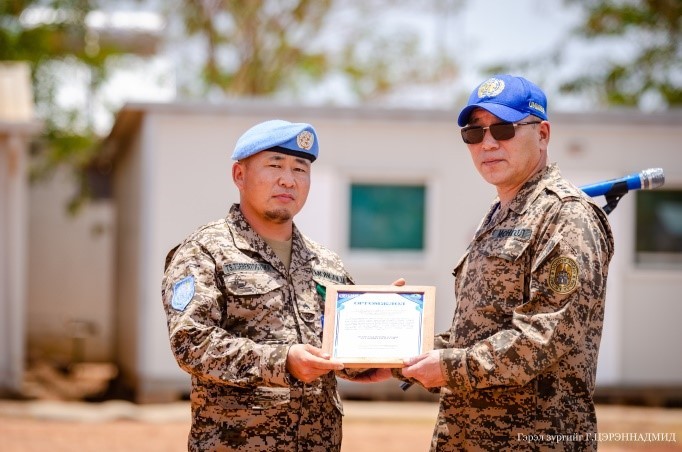 Бүгд Найрамдах Өмнөд Судан Улсад явагдаж буй НҮБ-ын UNMISS энхийг дэмжих ажиллагаанд үүрэг гүйцэтгэж буй хурандаа Д.Энхбаатар захирагчтай Монгол Улсын Зэвсэгт хүчний X ээлжийн цэргийн багийн бие бүрэлдэхүүн өнгөрсөн сарын 30-ны өдөр дөрөвдүгээр сард гүйцэтгэсэн ажлаа дүгнэж, сахилгын дүнгийн хурлаа хийж, төгсгөлд нь Цэргийн тангараг давтах ёслолын ажиллагааг зохион байгууллаа.