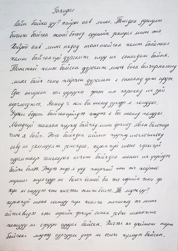 Сайн байна уу, хайрт аав минь. Таньдаа зориулж бичиж байгаа эхний бөгөөд сүүлийн захидал минь энэ. Хайрт аав минь надад таньтайгаа хамт байсан мөчөөс хамт байгаагүй цаг хугацаа илүү их санагдаж байна. Таньтай хамт байсан бага балчир насны тоотой хэдхэн дурсамж л санаанд орж ирдэг. Одоо өнгөрсөн цаг үерүүгээ эргэн нэг харахад их зүйл өөрчлөгджээ. Яагаад ч юм би танд зүгээр л гомддог. Учрыг нь бодож байгаагүй л дээ. Гэхдээ л би танд гомддог. Магадгүй жаахан хүүхэд байхад минь орхиод явсан болохоор тэр байх. Бага байхдаа айлын хүүхэд шоглочихоод аавд нь зэмлүүлж зогсохдоо, харанхуй шөнө гэрэлгүй гудамжаар ганцаараа алхаж байхдаа таныг их үгүйлдэг байж билээ.