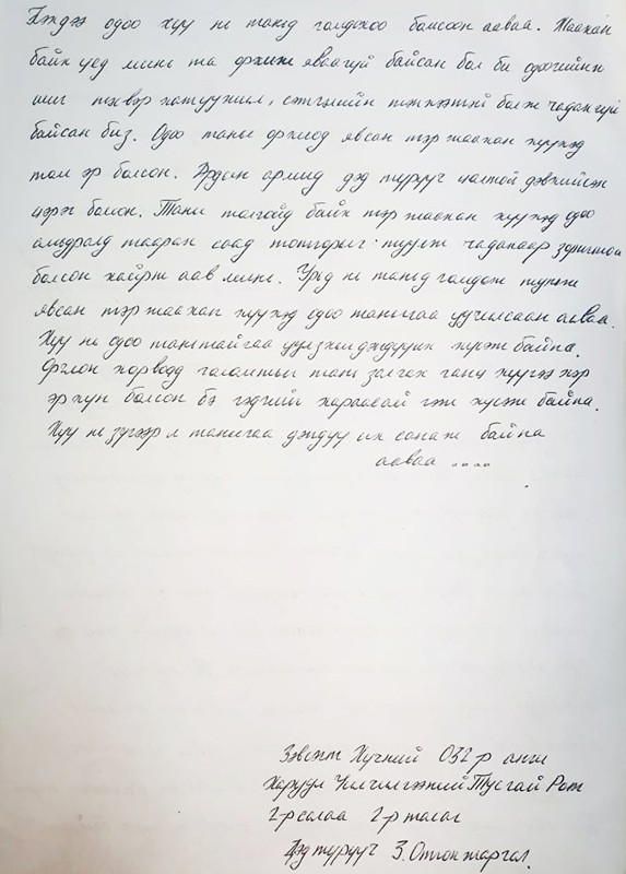 Одоо таны орхиод явсан тэр балчир хүүхэд том эр болсон. Ардын армид, дэд түрүүч цолтой дэвхийсэн цэрэг болсон. Таны толгойд байх тэр жаахан хүүхэд одоо амьдралд таарсан саад тотгорыг туулж чадахаар зоригтой болсон шүү, хайрт аав минь. Урьд нь таньд гомдож, туньж явсан тэр жаахан хүү таныгаа уучилсан ааваа. Хүү нь одоо тантайгаа уулзахыг дэндүү их хүсэж байна, ааваа. Орчлон хорвоод голомтыг тань залгах ганц хүүгээ ямар эр хүн болсон бэ гэдгийг хараасай гэж хүсэж байна. Хүү нь зүгээр л таныгаа дэндүү их санаж байна. Ааваа.