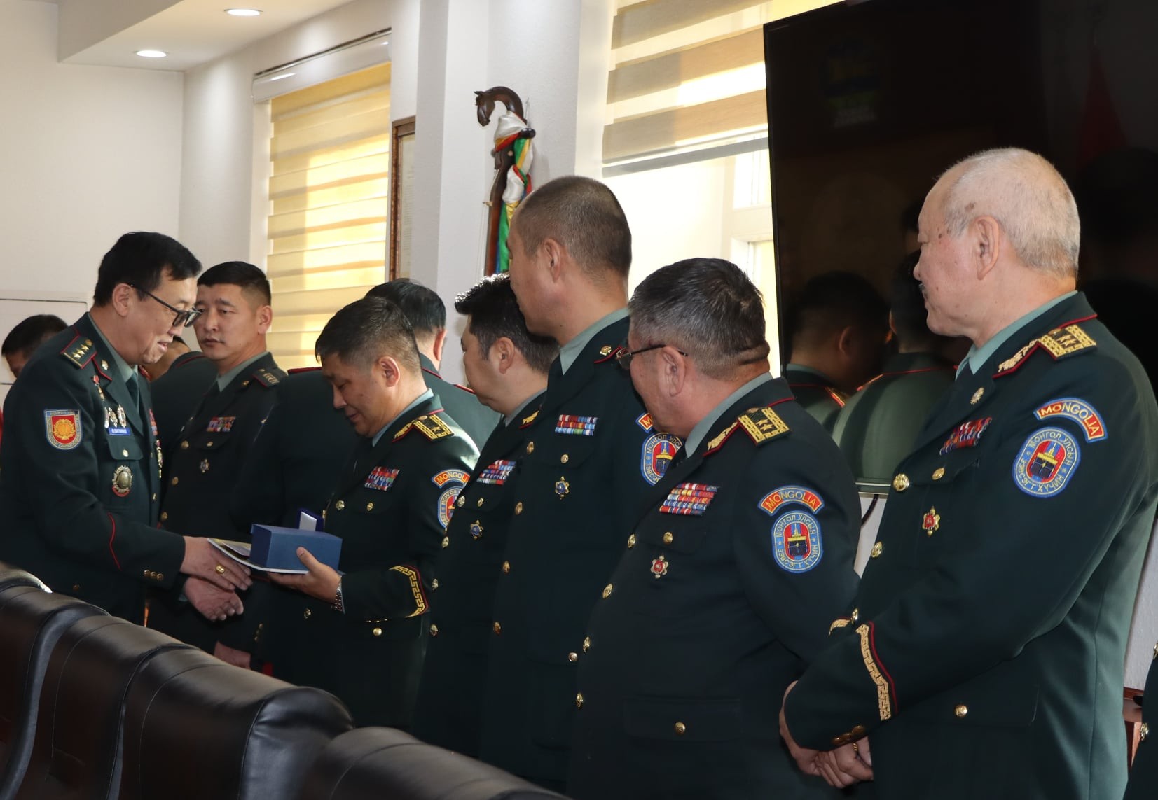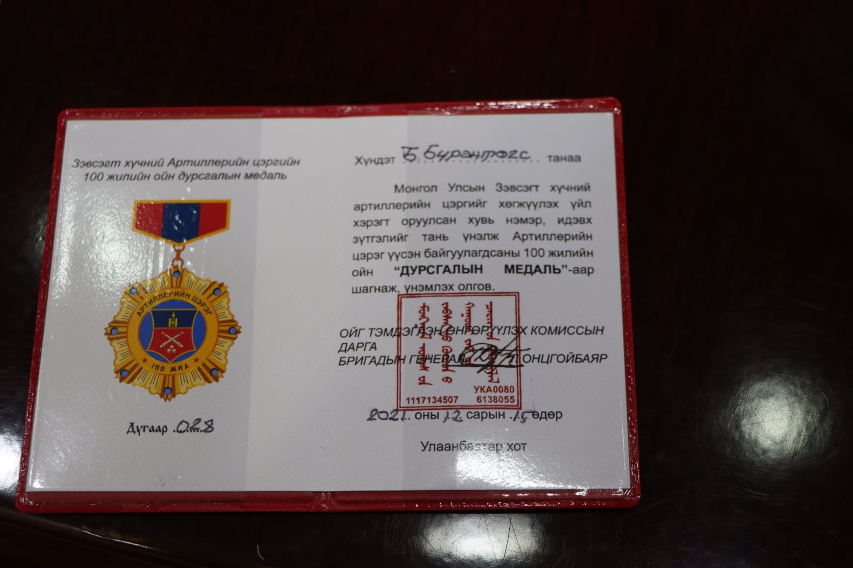 Энэхүү түүхт ойн баярыг тохиолдуулан шинээр бүтээсэн Артиллерийн цэргийн 100 жилийн ойн дурсгалын медаль, “Монгол Улсын Зэвсэгт хүчний Артиллерийн цэрэг 100 жил” гэрэл зургийн цомгийг ЗХЖШ-ын дарга болон даргын зөвлөлийн гишүүдэд “Монголын артиллерийн цэргийн холбоо”-ны гүйцэтгэх захирал, бэлтгэл хурандаа Ж.Ванчинсүрэн, удирдах зөвлөлийн гишүүн хурандаа Д.Мөнхсайхан, бэлтгэл хурандаа Ө.Батмөнх нар гардуулан өгсөн юм.