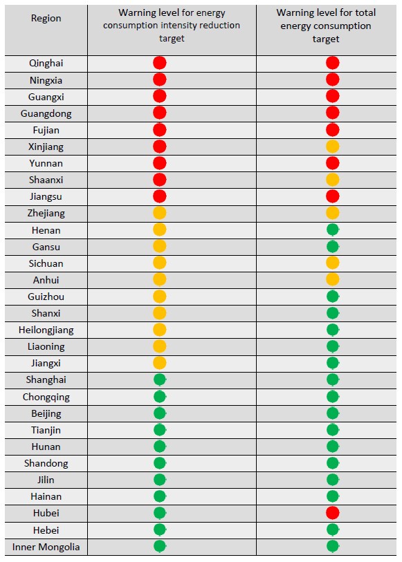 Эдгээр зорилтын дагуу мужуудын статусыг[1] ногоон, улбар шар, улаан гэх гэрлэн дохионы системээр зааж өгсөн бөгөөд ногоон нь асуудал бага, шар нь дунд зэргийн санаа зовниж байгааг, улаан нь тус мужууд эрчим хүчний зорилтоо биелүүлэхгүй байгааг харуулж байна. Чинхай, Ниншя, Гуанси, Гуандун, Фүжян, Юньнань, Жянсу мужууд “хос улаан” зэрэглэлд (эрчим хүчний хэрэглээ болон нүүрстөрөгчийн ялгаруулалтын квотоо хэтрүүлсэн) орсон байна. Хубэй зэрэг ганц улаан үзүүлэлттэй бусад мужууд хос хяналтын арга хэмжээ авах зорилгоор “1-р түвшний” яаралтай ангилалд багтсан хэвээр байв.