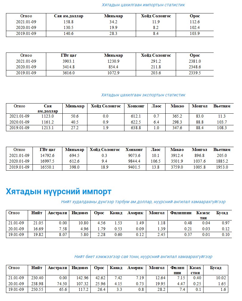 Хятад улс жилдээ дотооддоо 3.5-3.8 тэрбум тонн нүүрс олборлодог ба нүүрсний ангилал хамаарахгүйгээр жилд нийт 250-280 сая тонн нүүрс гаднаас импортолдог. Өнгөрсөн жилүүдэд Австрали, Индонез Хятадын гадаад импортын 50-60 хувийг хангасан бөгөөд Австрали, Хятадын сөргөлдөөний улмаас өнгөрсөн оны 11 дүгээр сараас Австралиас нүүрс авахаа бүр мөсөн зогсоосон. Үүнээс улбаалан Хятад руу хийх Индонез, Орос, Канад, Америк, Филиппиний нүүрс нийлүүлэлт бодит хэмжээ өнгөрсөн жилийн мөн үетэй харьцуулахад 30-аас дээш хувиар, нүүрсний үнэ өсөлттэй хамаарсан экспортын орлого нь үлэмж хэмжээгээр өссөн байна. Эрчим хүч үйлдвэрлэлд ганц нүүрс бас чухал биш бөгөөд нефть, газ бусад цэвэр эрчим хүчний эх үүсвэрүүдийн нийлүүлэлт нэмэгдсэн.