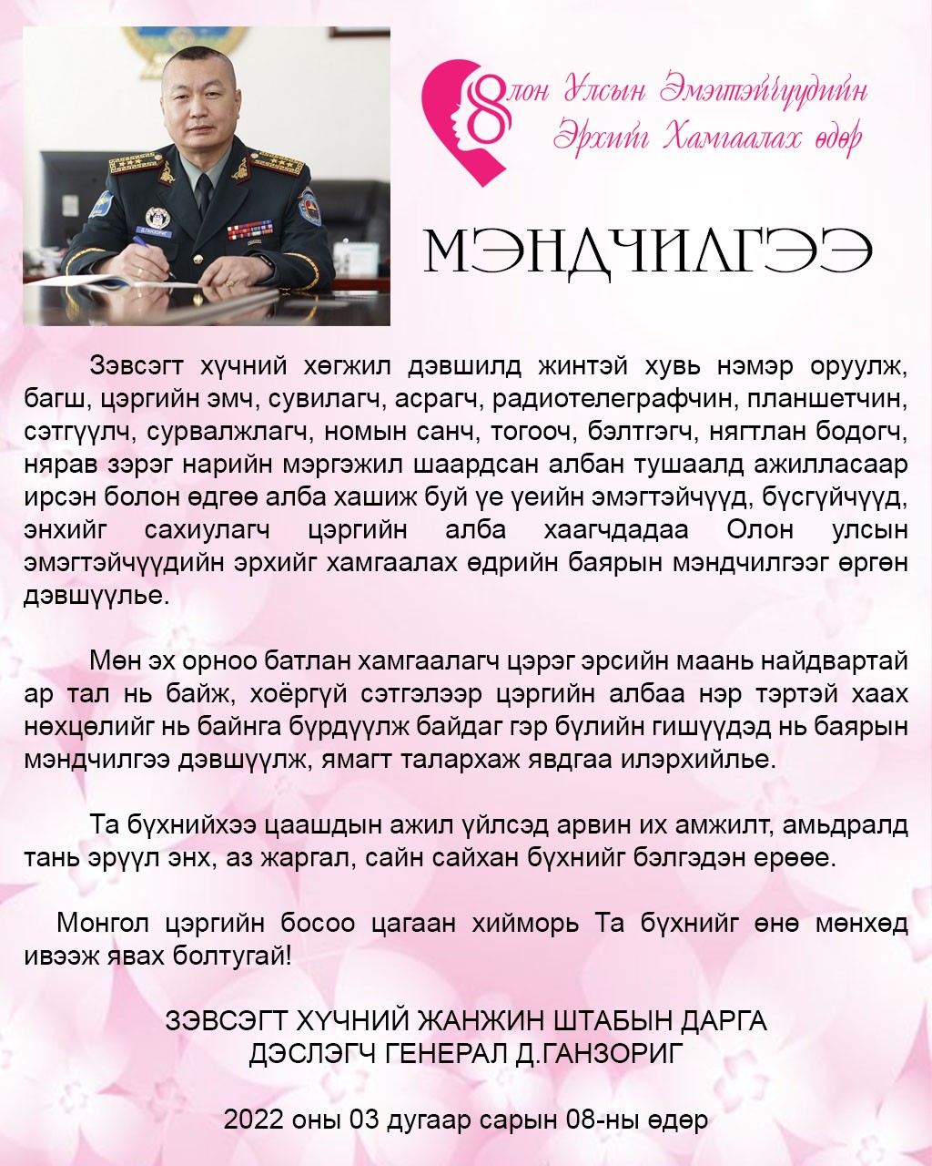 ЗЭВСЭГТ ХҮЧНИЙ ЖАНЖИН ШТАБЫН ДАРГА ДЭСЛЭГЧ ГЕНЕРАЛ Д. ГАНЗОРИГ ОЛОН УЛСЫН ЭМЭГТЭЙЧҮҮДИЙН ЭРХИЙГ ХАМГААЛАХ ӨДРИЙН МЭНДЧИЛГЭЭ ДЭВШҮҮЛЛЭЭ