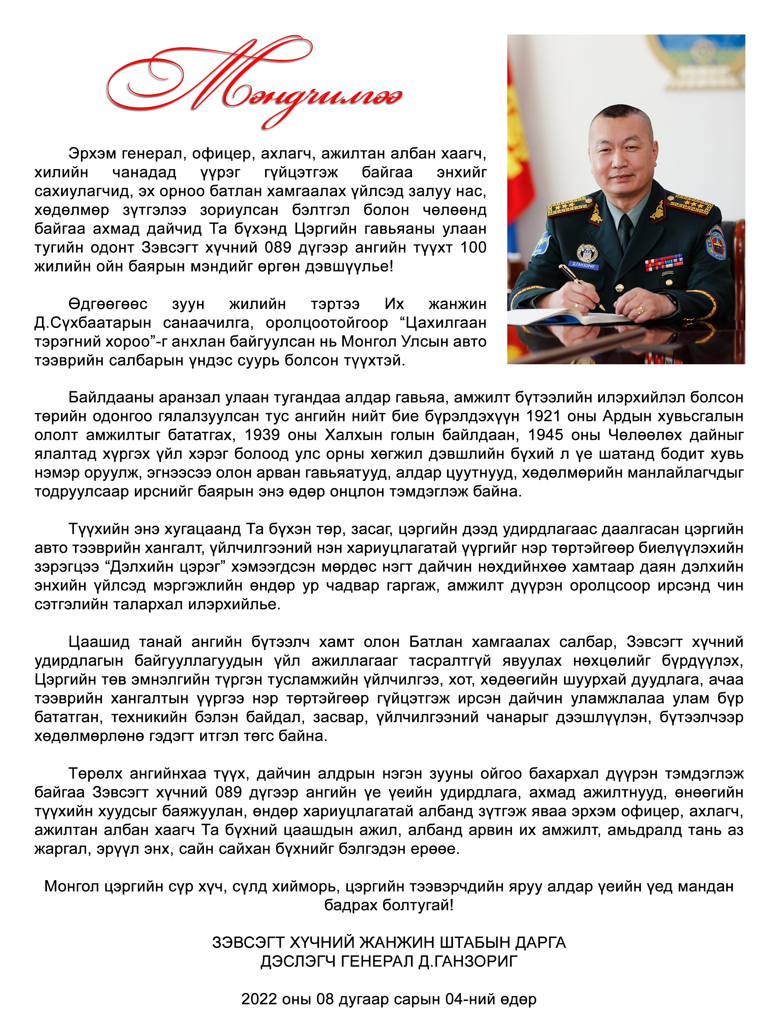 ЗХЖШ-ЫН ДАРГА ДЭСЛЭГЧ ГЕНЕРАЛ Д.ГАНЗОРИГ ЗЭВСЭГТ ХҮЧНИЙ 089 ДҮГЭЭР АНГИЙН 100 ЖИЛИЙН ОЙН БАЯРЫН МЭНДЧИЛГЭЭ ДЭВШҮҮЛЛЭЭ