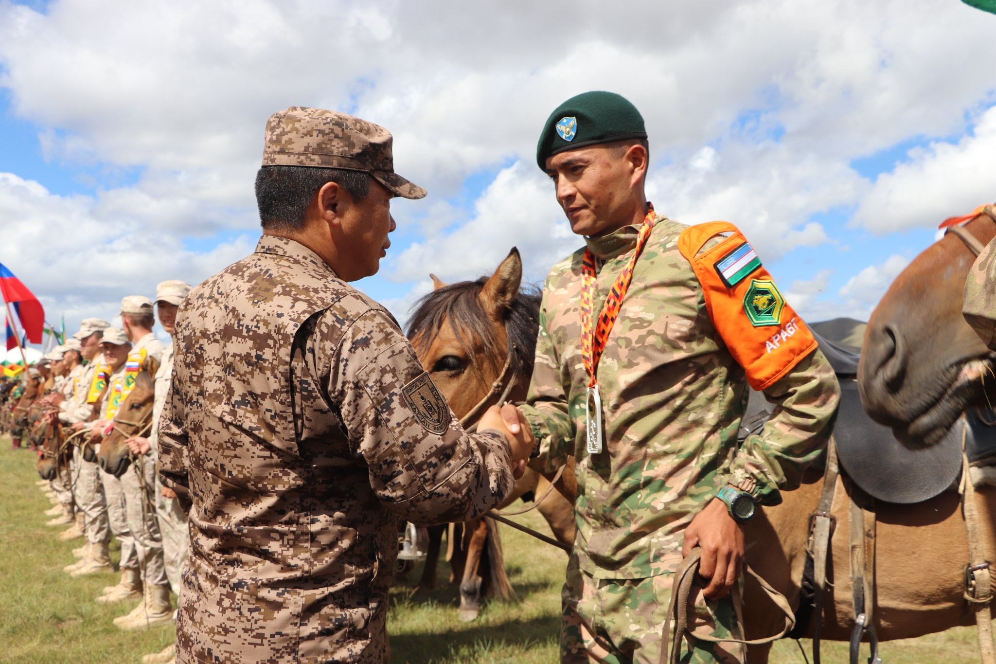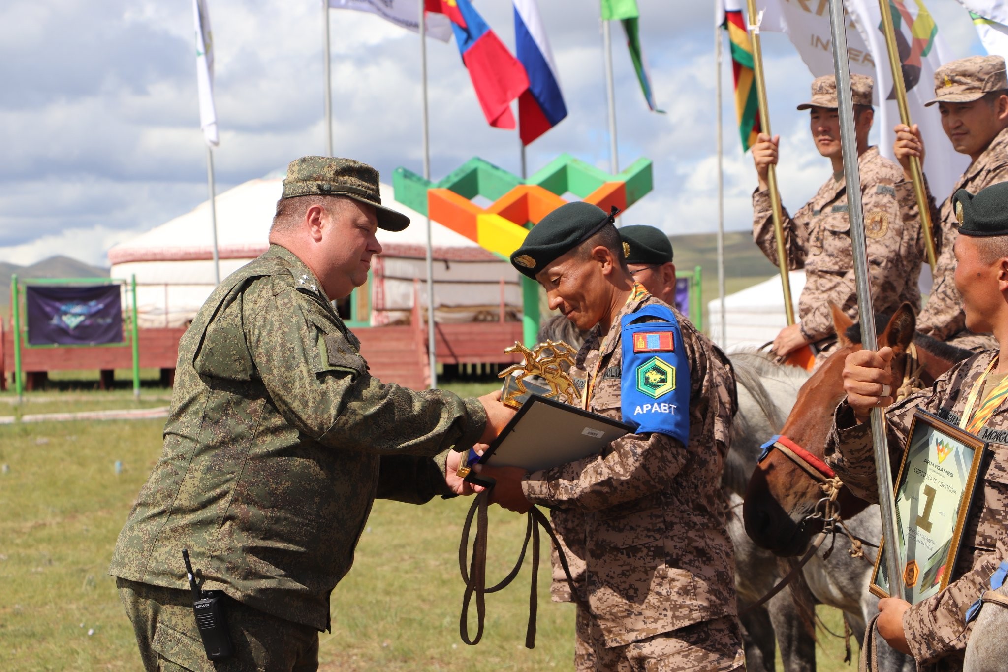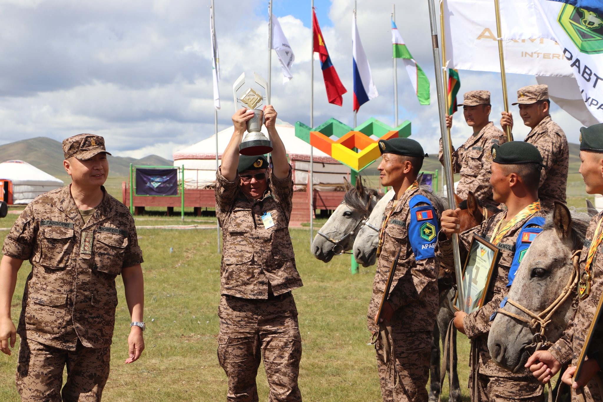 ЗХЖШ-ын дарга, дэслэгч генерал Д.Ганзориг морьтон дайчдад баяр хүргэж хэлсэн үгэндээ “Оросын Холбооны Улсын Батлан хамгаалах яамнаас санаачлан зохион байгуулдаг дэлхийн улс орнуудын эв нэгдлийн гүүр болж, цэрэг, армиудыг энхийн зорилго дор нэгтгэж, цэргийн хамтын ажиллагаа, харилцан итгэлцлийг бэхжүүлэхэд үнэтэй хувь нэмэр оруулж байгаа “Олон улсын цэргийн наадам”-ын онцгой төрөл болсон Олон улсын “Аравт” морин цэргийн уралдаан 2 дахь удаагаа нарлаг монгол оронд минь Та бидний хамтын хүчин чармайлтын үр дүнд амжилттай сайхан явагдаж дууслаа.