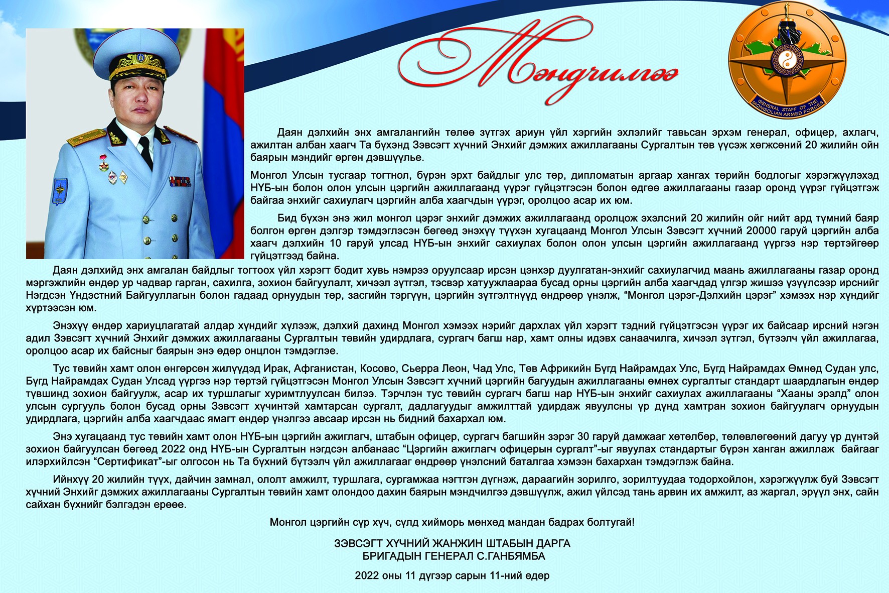 ЗХЖШ-ЫН ДАРГА БРИГАДЫН ГЕНЕРАЛ С.ГАНБЯМБА ЗЭВСЭГТ ХҮЧНИЙ ЭНХИЙГ ДЭМЖИХ АЖИЛЛАГААНЫ СУРГАЛТЫН ТӨВИЙН 20 ЖИЛИЙН ОЙГ ТОХИОЛДУУЛАН БАЯРЫН МЭНДЧИЛГЭЭ ДЭВШҮҮЛЛЭЭ