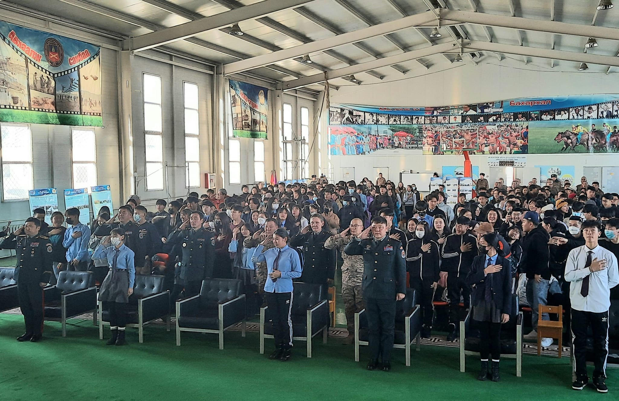 Сурагчдыг Үлээвэр найрал хөгжмийн аялгуун дор угтаж, уулзалт, өдөрлөгийн эхэнд Зэвсэгт хүчний болон тус ангийн үйл ажиллагааг харуулсан үзэсгэлэнг үзүүлж сонирхуулав.