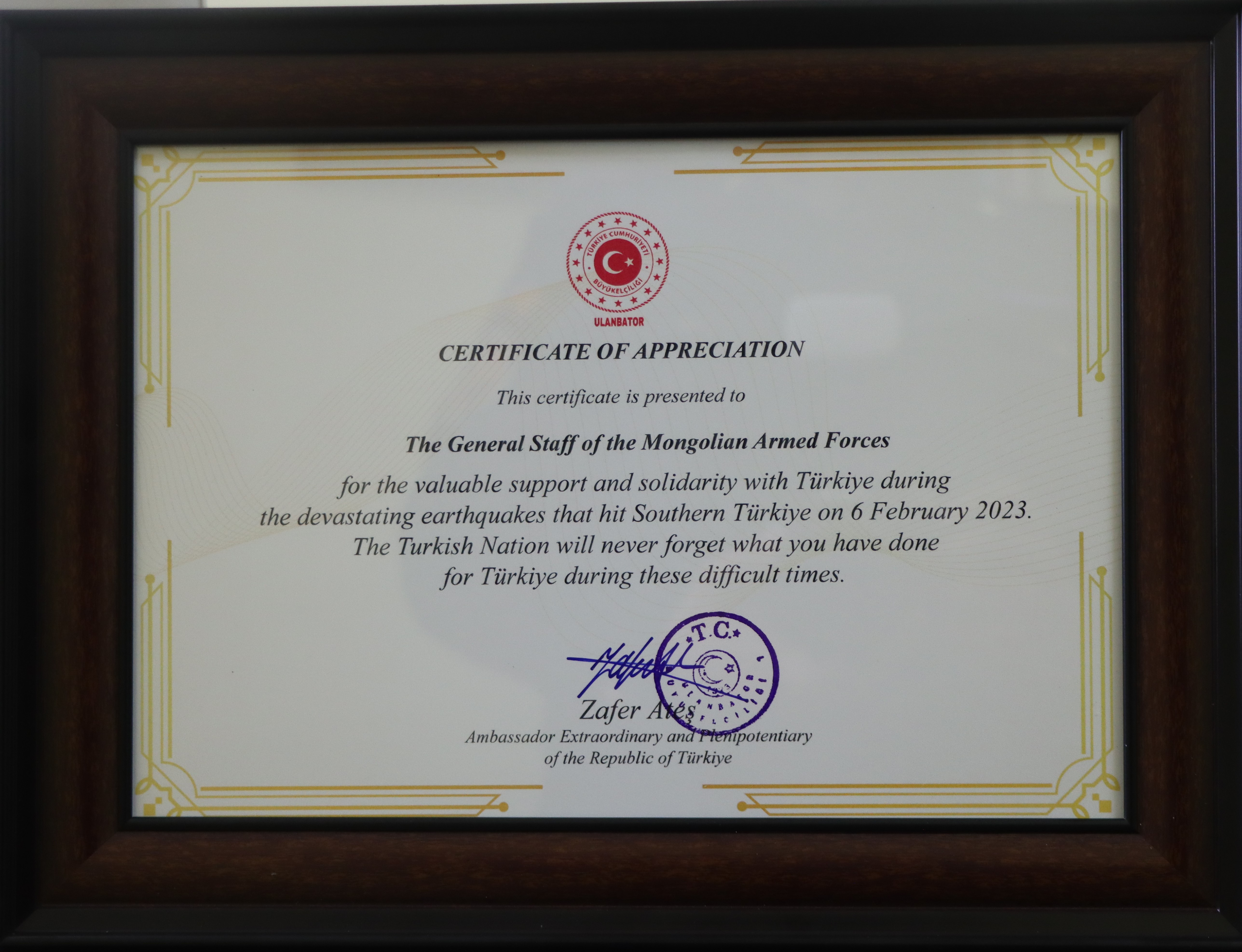 Уулзалтын төгсгөлд Элчин сайд Зафер Атеш Монгол Улсын Зэвсэгт хүчний Жанжин штабын дарга бригадын генерал С.Ганбямбад болон Зэвсэгт хүчний нийт бие бүрэлдэхүүнд Бүгд Найрамдах Турк Улсад энэ оны 2 дугаар сарын 6-ны өдөр тохиосон газар хөдлөлтөд нэрвэгдсэн бүс нутагт Монгол Улсаас эрэн хайх, аврах багийг илгээн 10 хоногийн хугацаанд 8 хүний амийг аварч, 700 гаруй иргэдэд эмнэлгийн тусламж үйлчилгээг үзүүлсэн явдалд гүнээ талархаж байгаагаа илэрхийлсэн юм.
