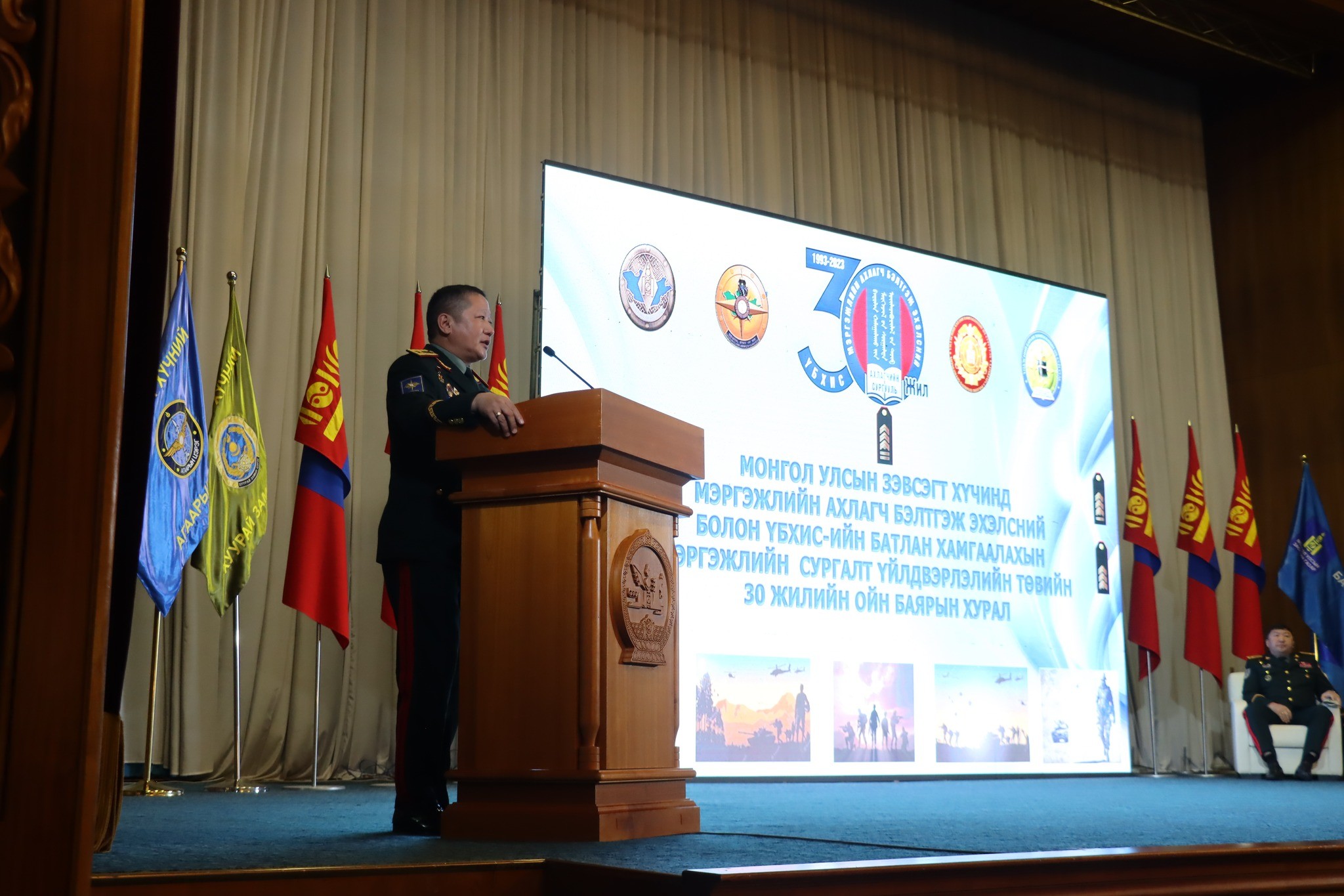 Мөн энэ үеэр ЗХЖШ-ын дарга бригадын генерал С.Ганбямба баяр хүргэж хэлсэн үгэндээ ҮБХИС-ийн Батлан хамгаалах мэргэжлийн сургалт-Үйлдвэрлэлийн төвийг үүсгэн байгуулах, хөгжүүлж, бэхжүүлэх бахдам үйлсэд оюун ухаан, хөдөлмөр зүтгэлээ зориулсан үе үеийн удирдлага, эрдэмтэн багш, төгсөгч, сонсогчдодоо түүхт 30 жилийн ойн баярын мэндийг өргөн дэвшүүлээд Монгол Улсын Зэвсэгт хүчин хуулиар хүлээсэн үндсэн болон бусад чиг үүрэг, төр засгаас хүлээлгэсэн улс орноо батлан хамгаалах хариуцлагатай бөгөөд хойшлуулшгүй үүргээ ёсчлон биелүүлэх Батлан хамгаалах, Зэвсэгт хүчний дэвшүүлсэн зорилго, зорилтуудыг тууштай хэрэгжүүлэхэд ахлагчийн нийт бие бүрэлдэхүүн, мэдлэг боловсрол, бие сэтгэл хичээл зүтгэлээ харамгүй дайчлан ажилладагт талархаж явдгаа илэрхийлсэн юм.