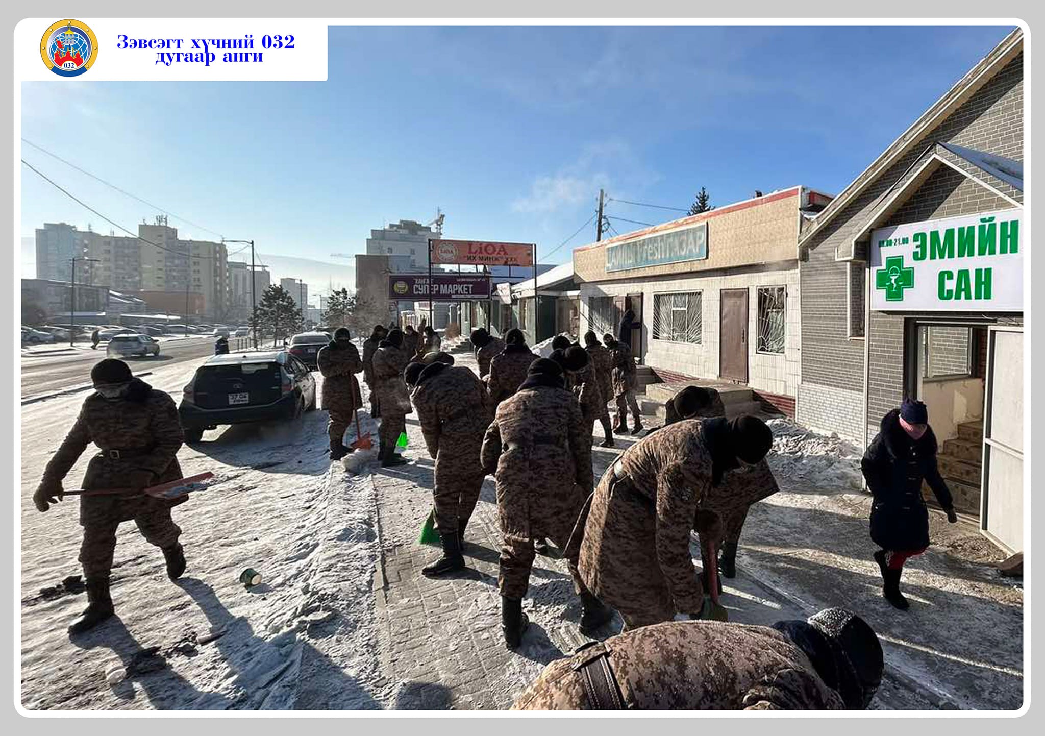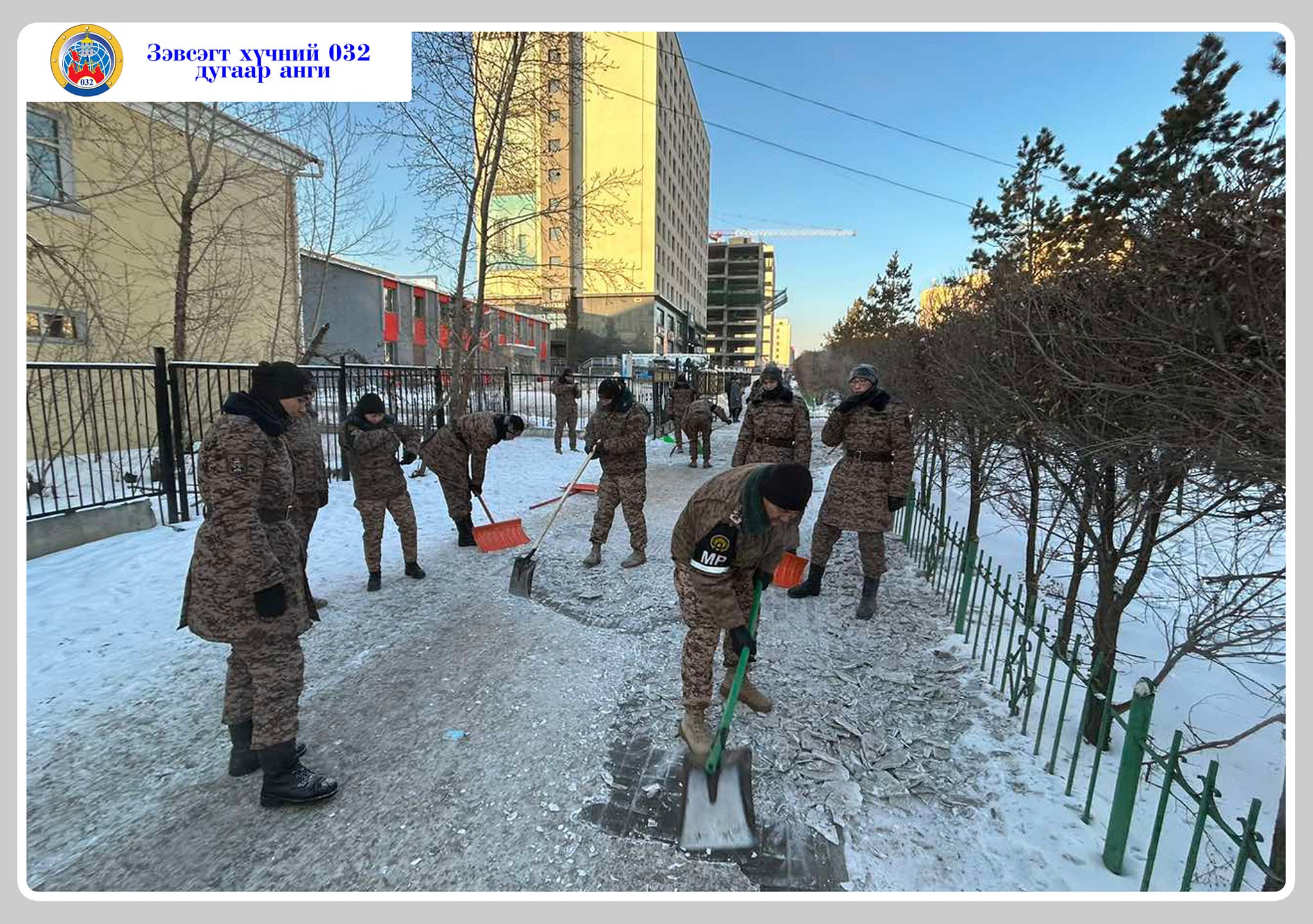 Зэвсэгт хүчний 032 дугаар ангийн бие бүрэлдэхүүн өнгөрсөн өдөр нийгмийн хариуцлагын хүрээнд Цайзын уулзвараас, Офицеруудын тойргийн уулзвар хүртэлх явган хүний зорчих хэсгийг цэвэрлэж, иргэд, олон нийтийн аюулгүй зорчих нөхцлийг бүрдүүлэн ажиллалаа. Цэвэрлэгээнд нийт 200 гаруй офицер, ахлагч, ажилтан албан хаагч, хугацаат цэргийн алба хаагчид оролцлоо.
