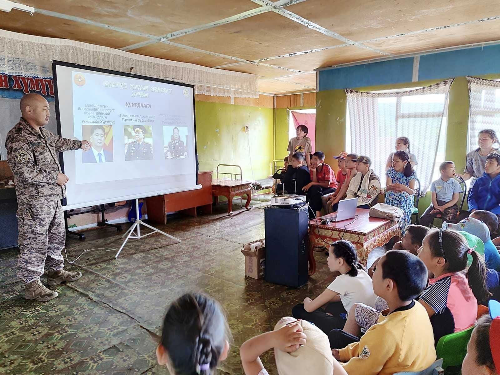 Мөн “Байгальд амьд арга ухаан” төслийн хүрээнд заагддаг сургалтыг хүүхэд багачуудад зохион байгуулж, хүүхдүүдийн дунд хөгжөөнт тоглоом тоглуулан өрсөлдүүлж, шилдэг багт нь өргөмжлөл, дурсгалын зүйл хадгалуулсан юм. Хөтөлбөрийн төгсгөлд ангийн офицер, ахлагч нараас хандиваар цуглуулсан хүүхдийн хувцас, тоглоом, хичээлийн хэрэглэл, ном зэргийг “Өнөр бүл хүүхдийн төв”-ийн асрамж, халамж үйлчилгээний хэлтсийн дарга Д.Цагаанжанарт гардуулан өгсөн юм.