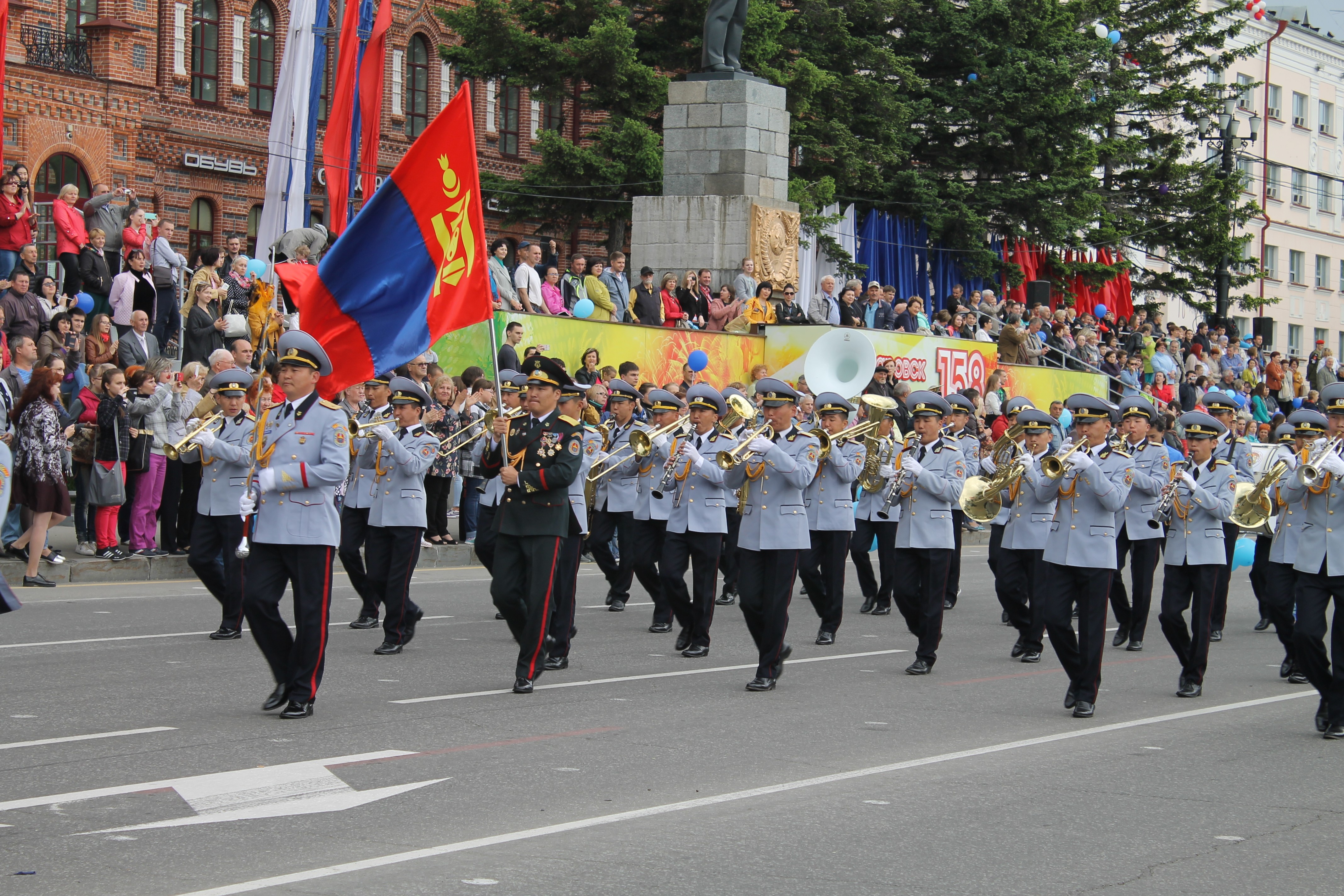 Харин 5 дугаар сарын 29-ний өдөр Лениний нэрэмжит гудамжаас Залуучуудын гудамж хүртэлх өргөн чөлөөгөөр хөгжимтэй ёслолын жагсаал, хүндэтгэлийн ажиллагааг зохион байгуулсан юм. Хабараовск хотын 168 жилийн ойд зориулсан цэргийн хөгжимтэй жагсаалын үеэр бүх албан байгууллагууд туг, дарцаг, цэцэг барьж, сурталчилгааны үзүүлэнгүүдээ дэлгэн явган болон авто машинтайгаар жагсаалаар явж байсан нь сонирхолтой байсны дээр энэ баяртай давхцан Амур мөрний дээрх алдарт гүүрийг байгуулсны 100 жилийн ой тохиож буй нь бас л онцлог байлаа.