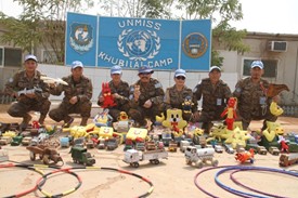 Ёслолын ажиллагааны төгсгөлд 200 гаруй хүүхдэд дурсгалын зүйл, хичээлийн хэрэгсэл, хувцас зэргийг бэлэглэн, батальоны эмэгтэй цэргийн алба хаагчид монгол орны талаарх танилцуулга, дүрс бичлэг, хүүхэлдэйн кино үзүүлж, цаасаар хайчилбар хийх хичээлийг зааж өгсөнд хүүхдүүд маш их баярлан хүлээн авч байсныг онцлон тэмдэглэе. Мөн энэ өдөр Париан суурингийн хүүхдийн цэцэрлэгээр зочилж, хүүхдүүдэд өөрсдийн урлан бүтээсэн 300 гаруй тоглоомоор бэлэг барилаа.