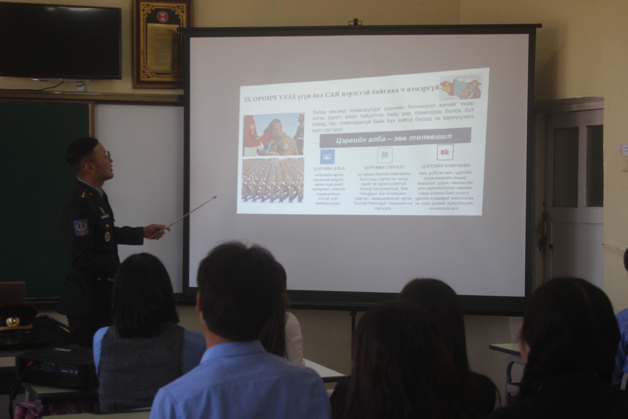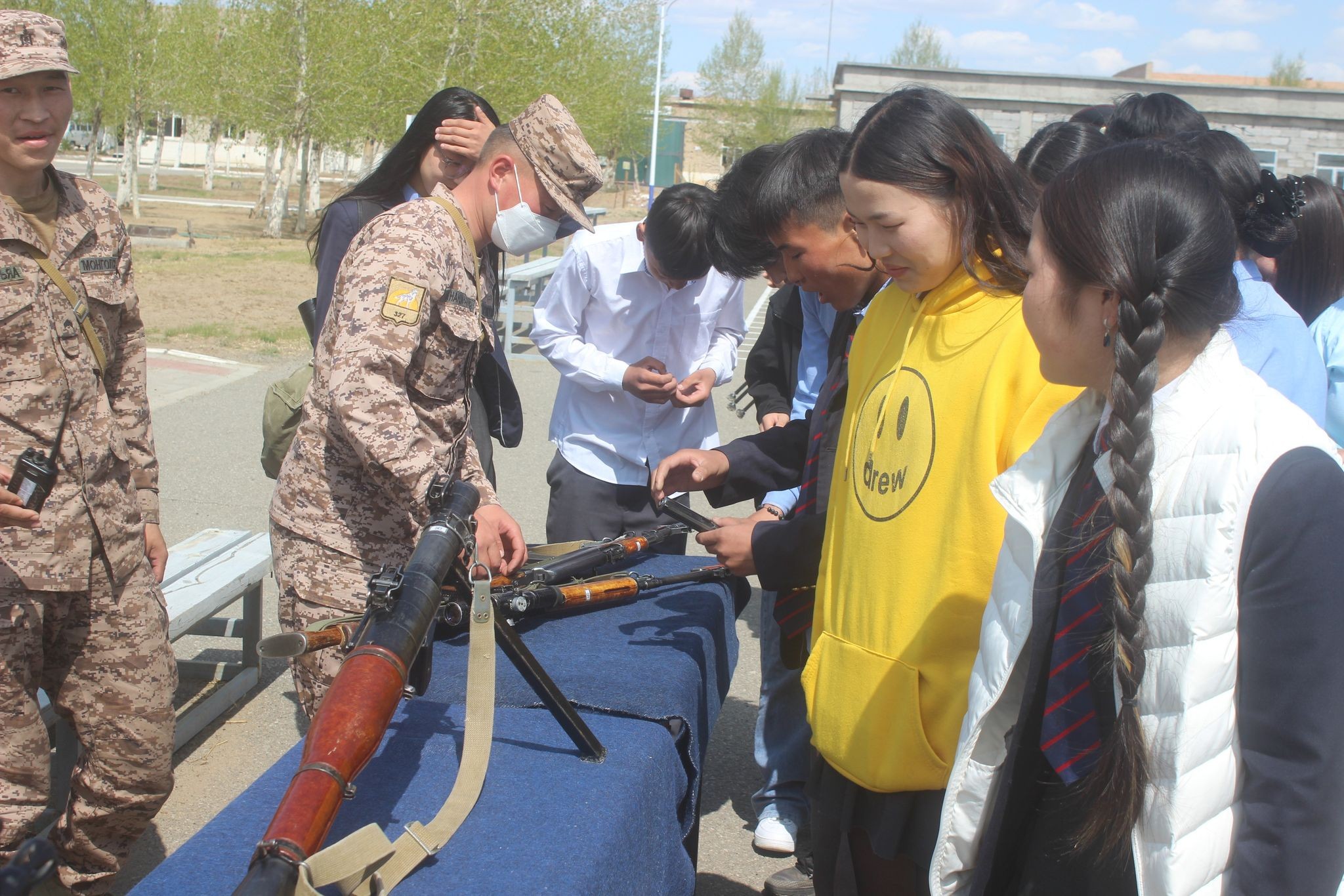 Энэхүү арга хэмжээний хүрээнд ахлах ангийн сурагчдыг ангийн байрлалд хүлээн авч урлагийн хэсэгчилсэн тоглолт, гардан жагсаалын үзүүлэх тоглолт, буудлагын зэвсэглэлийн үзэсгэлэнг сонирхууллаа.