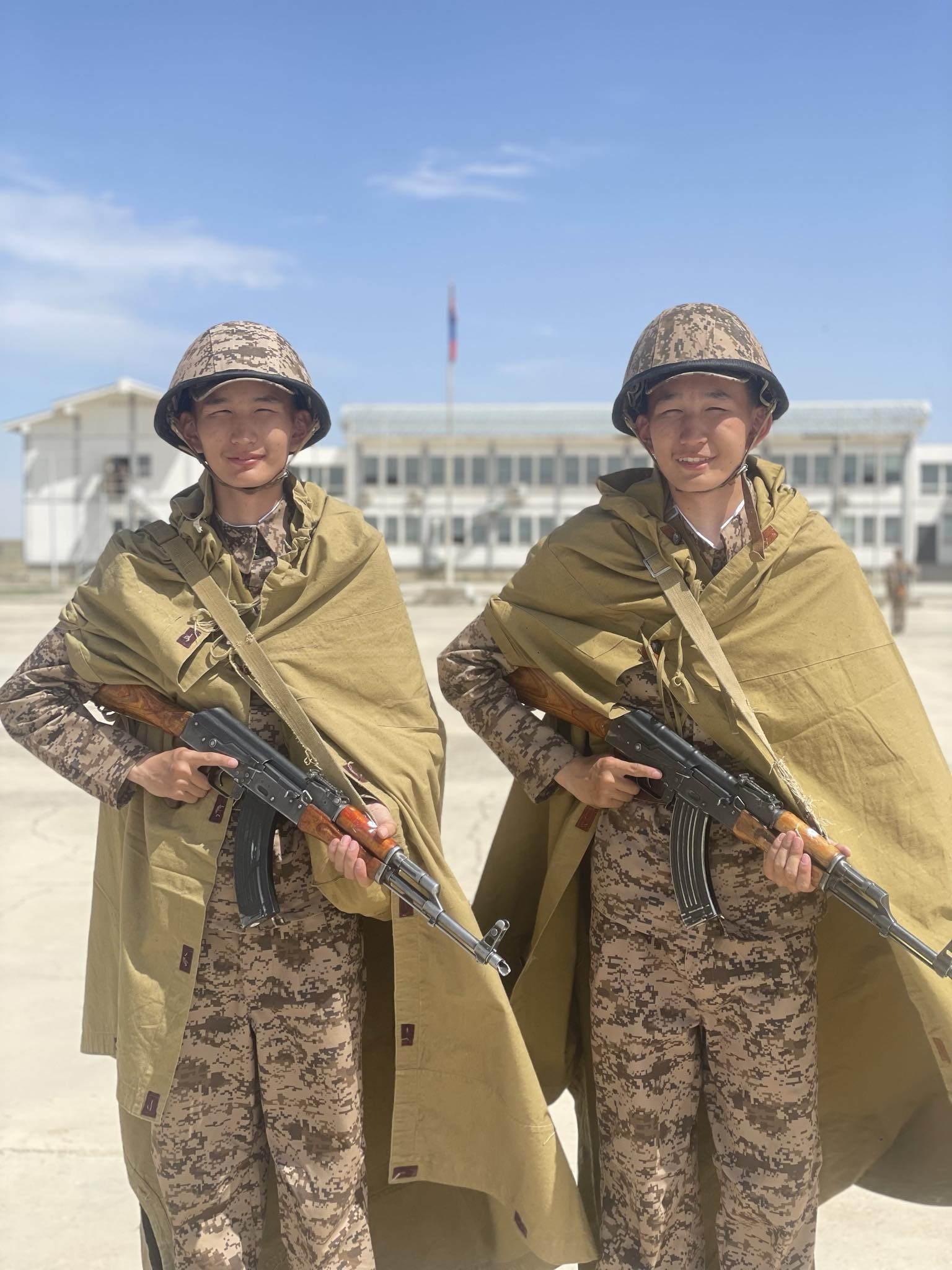 Зэвсэгт хүчний 167 дугаар ангийн говийн бүсийн Сургалтын төвийн “Оюутан цэрэг-2024” цэргийн мэргэжил олгох сургалтад хамрагдаж буй ихэр цэргүүд болох байлдагч Мөнх-Очирын Бат-Эрдэнэ, Мөнх-Очирын Баяр-Эрдэнэ нарыг онцолж байна.