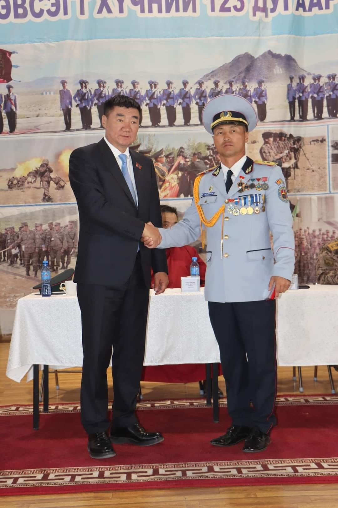 Түүнчлэн Зэвсэгт хүчний нэгтгэл, анги, байгууллагыг хүний хөгжлийн орчин болгох, салбарын алба хаагчдын нийгмийн хамгааллыг сайжруулах, гэрээт болон хугацаат цэргийн алба хаагчдын алба хаах хугацаанд амьдрах, ажиллах нөхцөлийг дээшлүүлэх, алба хаагчдыг орон сууцжуулах хөтөлбөр, төслийг хэрэгжүүлэх, мөн байнгын бүрэлдэхүүний цалин хөлс, нэмэгдлийг үе шаттайгаар нэмэгдүүлэхэд миний бие онцгойлон анхаарал хандуулж ажиллана гээд Зэвсэгт хүчний 123 дугаар ангийнхны ажил албанд өндөр амжилт хүслээ.