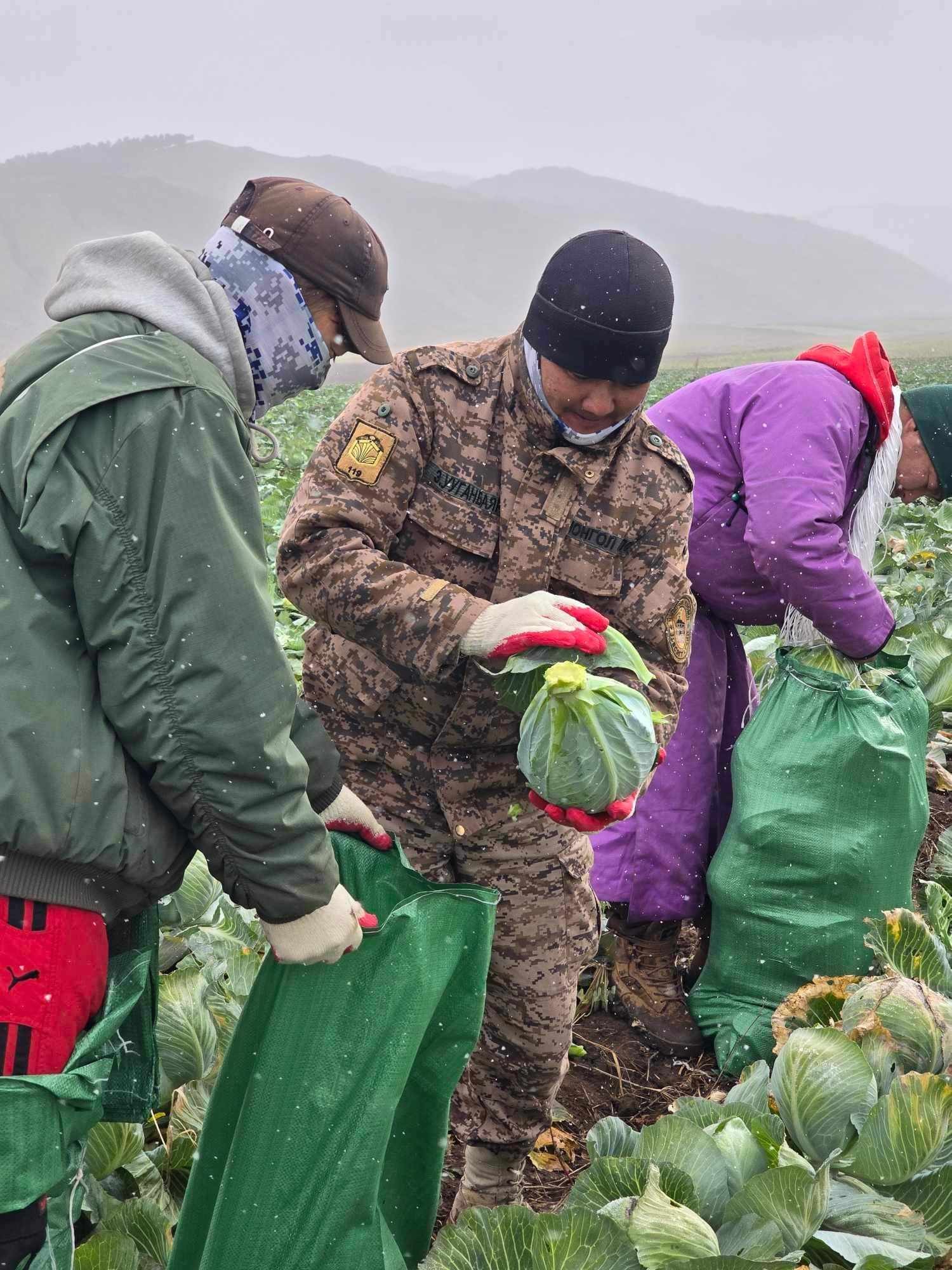 “Манай бүлэг өчигдөрхөн гарч ирлээ. Таван офицер, 15 ахлагч, нэг ажилтан алба хаагчтай. Тариалангийн талбайд ирэхэд эргэн тойронд манай цэргийн алба хаагчид дүүрэн байна. Намрын ургац хураалт цэргийнхний нуруун дээр яваа нь хаашаа ч харсан илхэн харагдана лээ. Энэ жил тэгээд хүнсний ногоо ч сайн ургаж, тариалан эрхлэгчдийн нар нь гарч байх шиг. Бид хүлээсэн үүргээ мадаггүй биелүүлээд харина даа” гэсэн мэдээллийг өглөө.