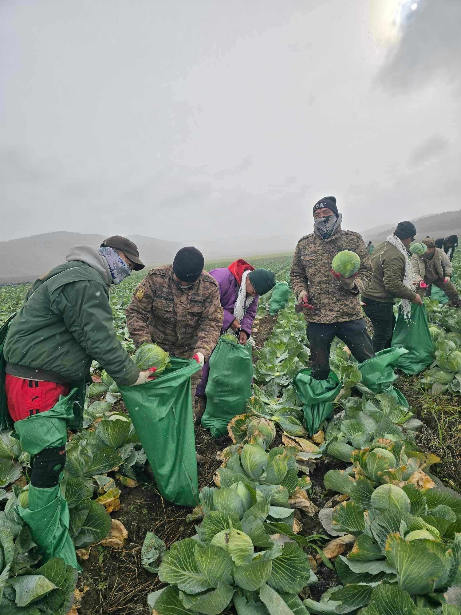 Үүнтэй холбогдуулан тус тус бүрэлдэхүүнийг ахлан ажиллаж байгаа офицеруудтай холбогдож, ургац хураалтын талаар тодруулсан бөгөөд Зэвсэгт хүчний 119 дүгээр ангийн салааны захирагч дэслэгч Э.Ууганбаяр “Манай химичин дайчид Төв аймгийн Борнуур суманд “Хар гүн” компанийн тариалангийн талбайд 09 дүгээр сарын 21-ний өдрөөс эхлэн ажиллаж байна. Таван офицер, 14 ахлагч, нэг цэргийн гэрээт алба хаагчтайгаар. Гарч ирснээсээ хойш төмс хураасан, өнөөдөр байцай руу орж байна. Ирэх 10 дугаар сарын 5-ны өдөр бууна. Даарч хөрсөн, ядарч цангасан зүйлгүй. Яг одоо бид нар тариалангийн талбайдаа ажиллаж байна, энд бага зэрэг цас орж байна” гэв.
