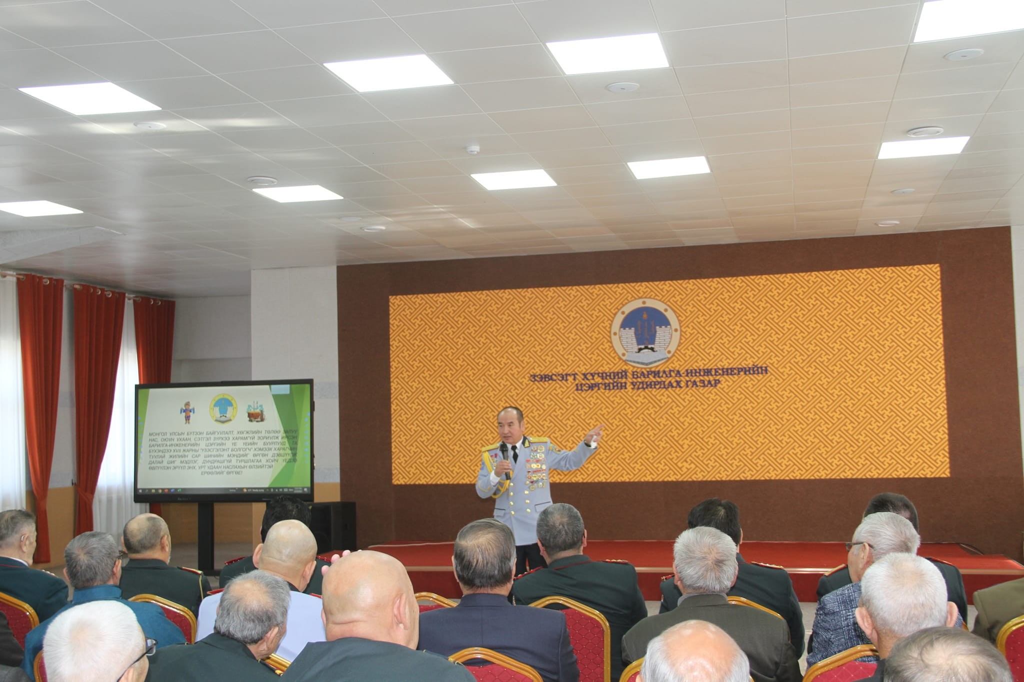 Тус ёслолын ажиллагаанд Барилга-инженерийн цэргийн өндөр настан, ахмад дайчдын төлөөлөл хүрэлцэн ирсэн бөгөөд удирдах газрын дарга хурандаа Х.Батсайхан Барилга-инженерийн цэргийн үндсэн үүрэг, хийж гүйцэтгэсэн бүтээн байгуулалтын төсөл, хөтөлбөр, ирээдүйн чиг хандлагын талаар танилцуулга хийж хүндэтгэл үзүүлэв.