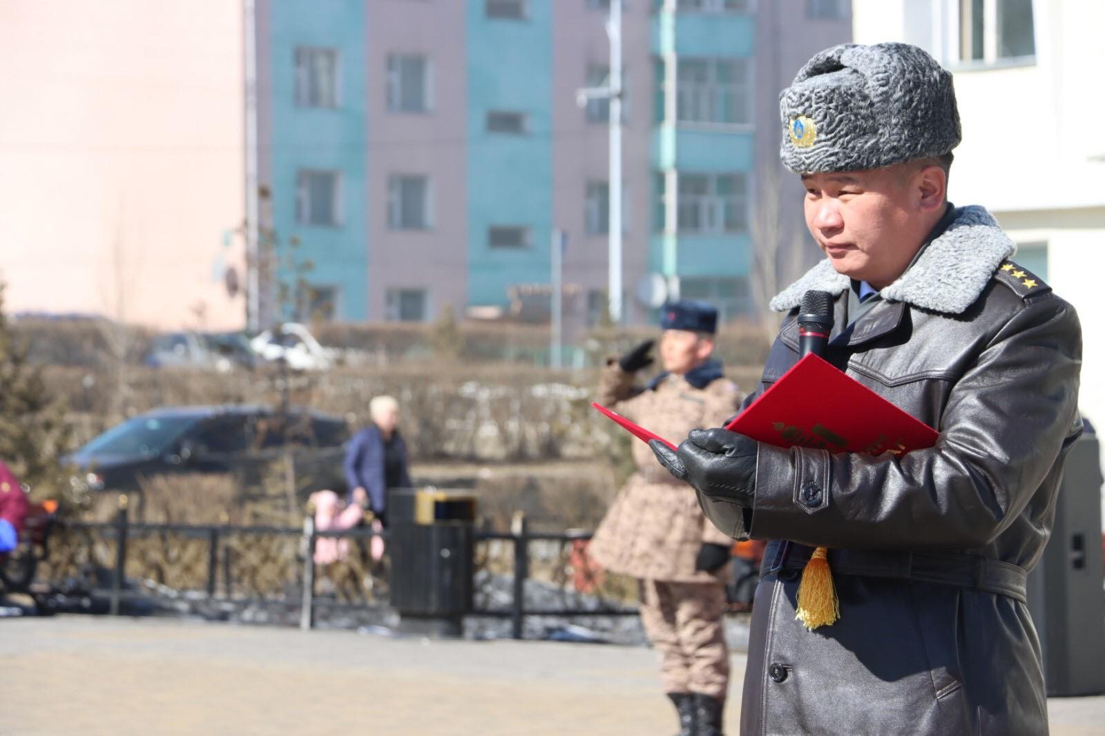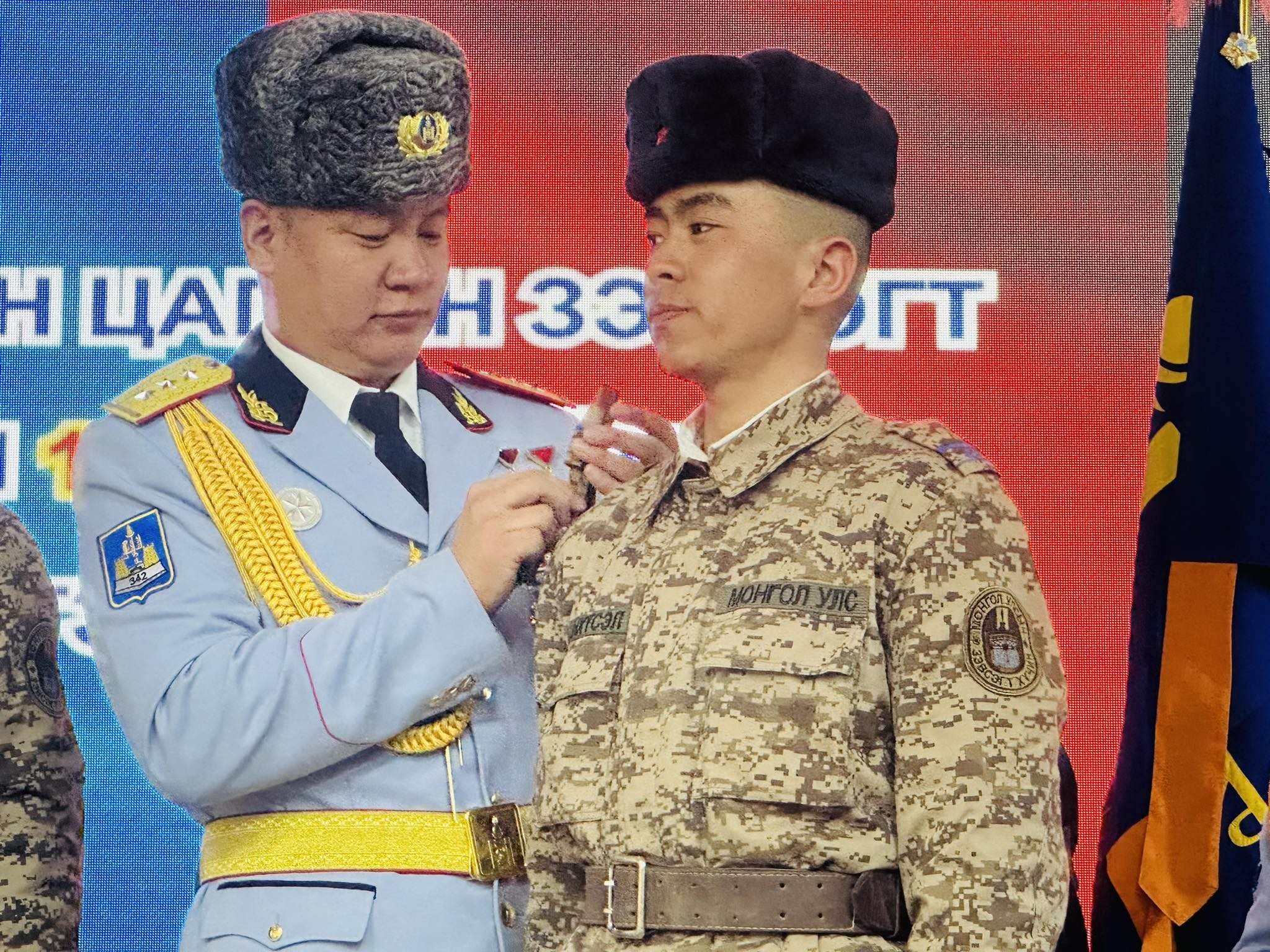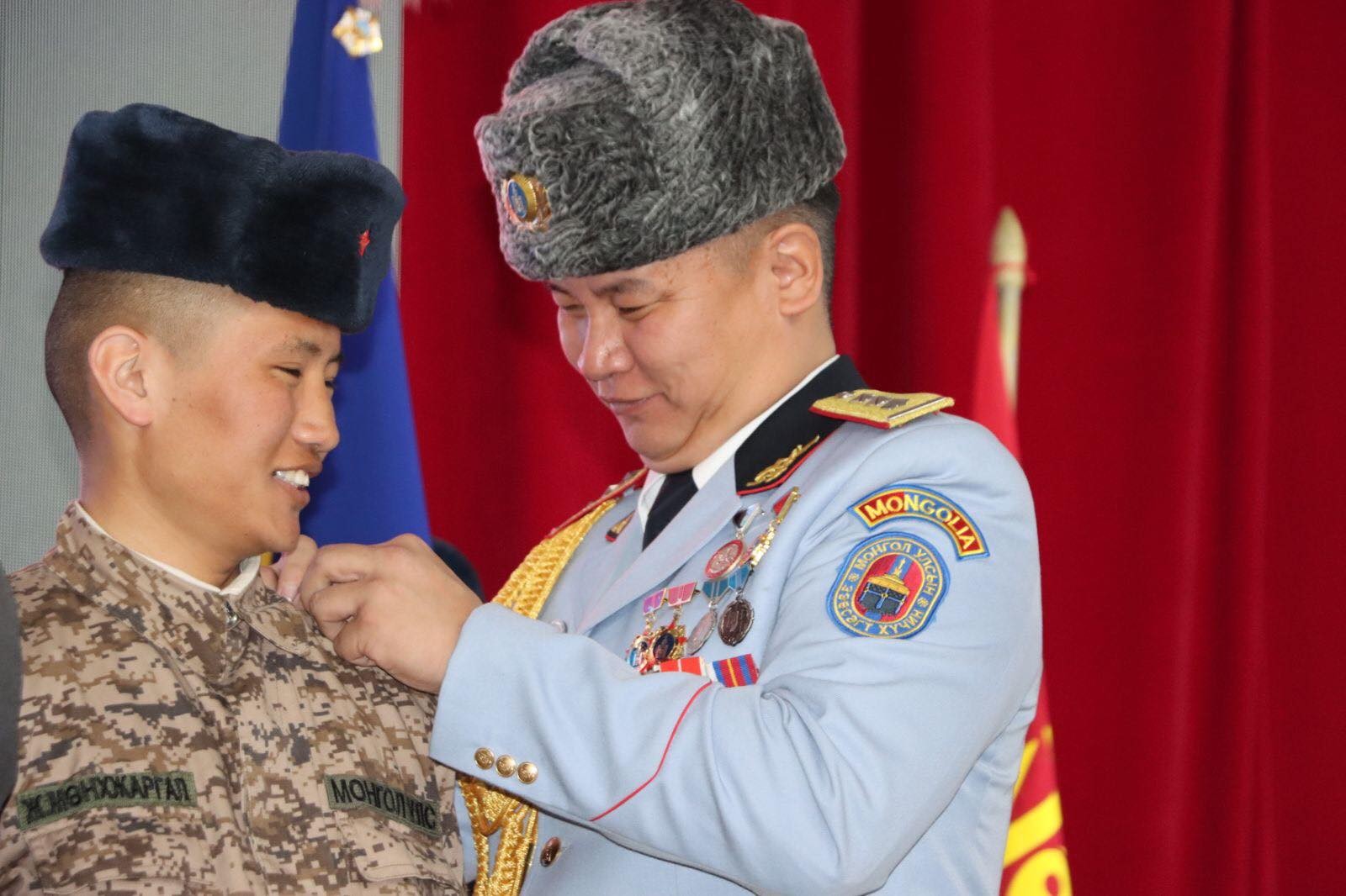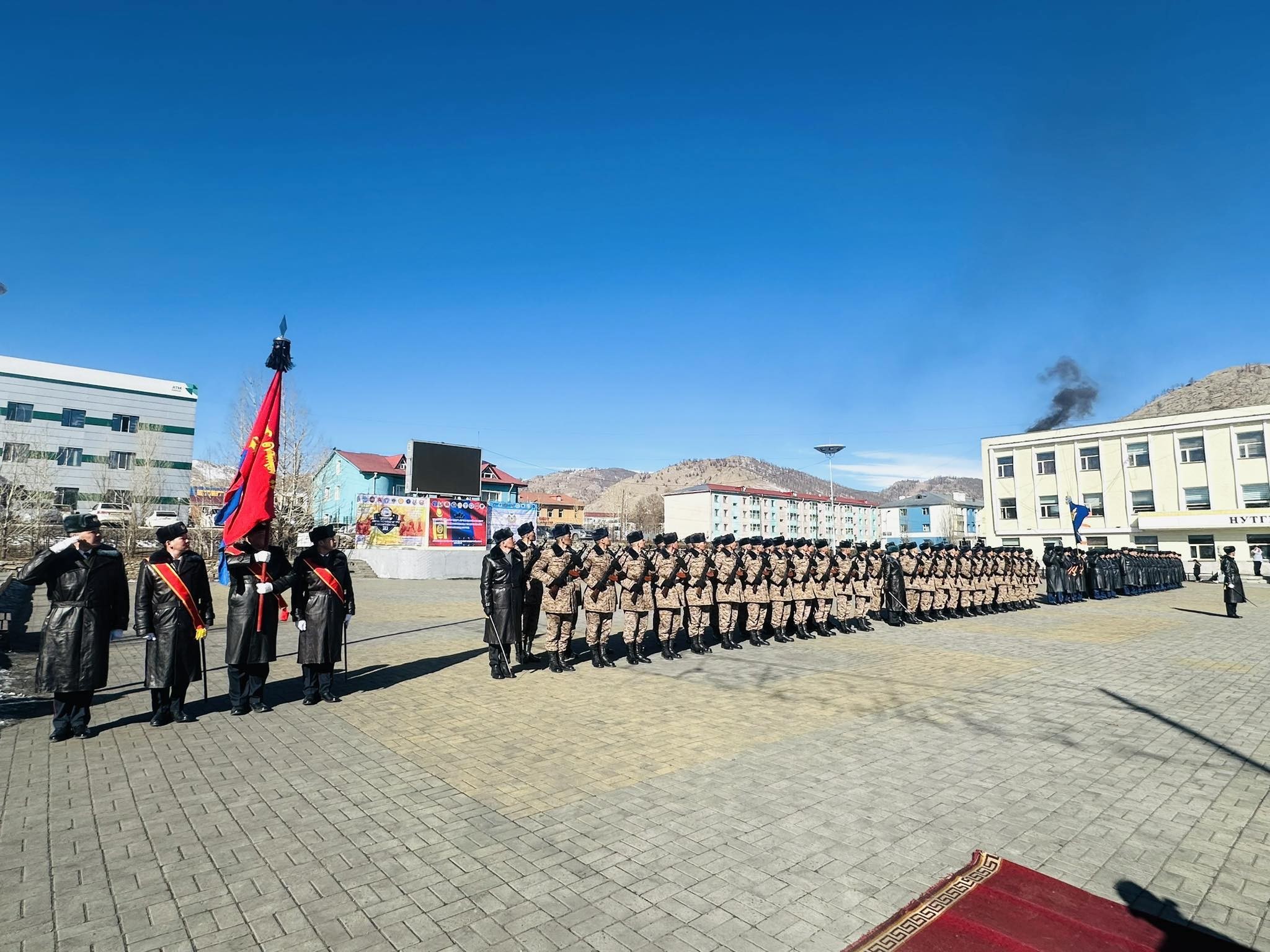 Төгсгөлд нь ангийн бие бүрэлдэхүүний эрхэмлэн дээдлэх ариун шүтээн золбоо хийморийн бэлгэдэл болон байлдааны тугаа залж, эх орондоо үнэнчийн баталгаа болсон Цэргийн тангаргаа давтлаа.