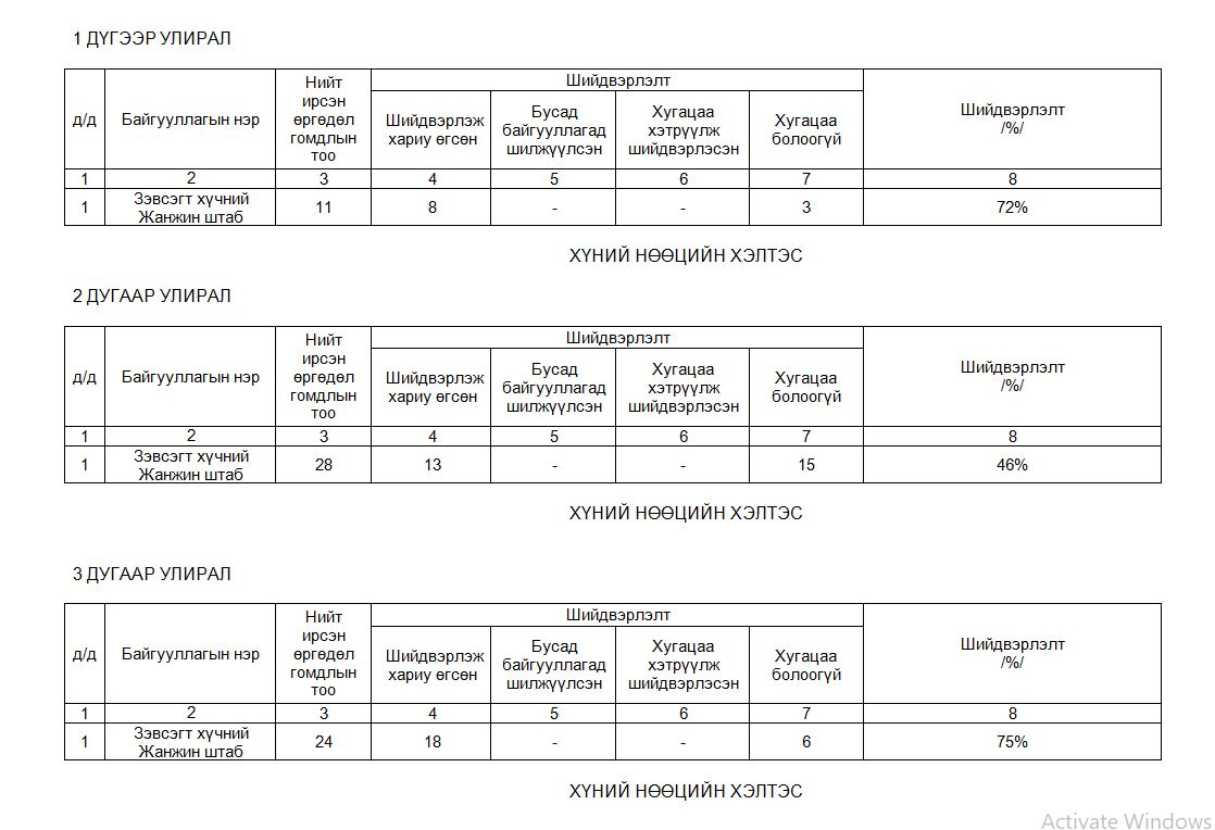 2019 ОНД ЦЭРГИЙН АЛБА ХААГЧ, ИРГЭДЭЭС ЗЭВСЭГТ ХҮЧНИЙ ЖАНЖИН ШТАБЫН АЛБАН ТУШААЛТНУУДАД ХАНДАЖ ИРҮҮЛСЭН ӨРГӨДӨЛ, ГОМДЛЫН ШИЙДВЭРЛЭЛТИЙН БАЙДАЛ