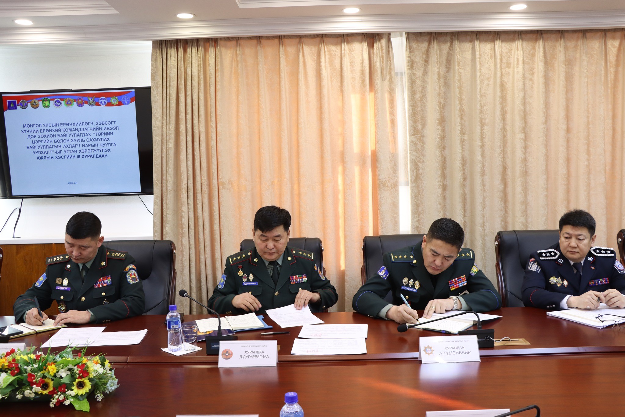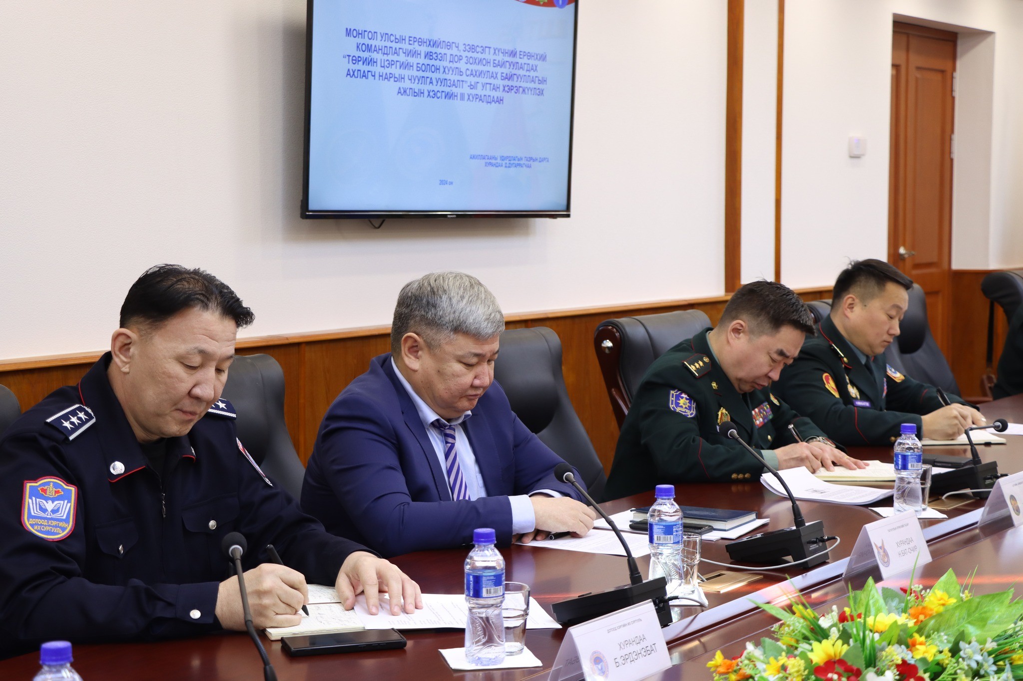 Энэхүү хуралдаанд ЗХЖШ-ын дарга хошууч генерал С.Ганбямба, Монгол Улсын Ерөнхийлөгчийн Батлан хамгаалах, цэргийн бодлогын зөвлөх бригадын генерал Д.Баасандамба, БХЯ-ны Төрийн захиргааны удирдлагын газрын дарга хурандаа Р.Энхболд болон ажлын хэсэгт томилогдсон Төрийн цэргийн болон хууль сахиулах байгууллагуудын удирдлагын төлөөлөл оролцлоо.