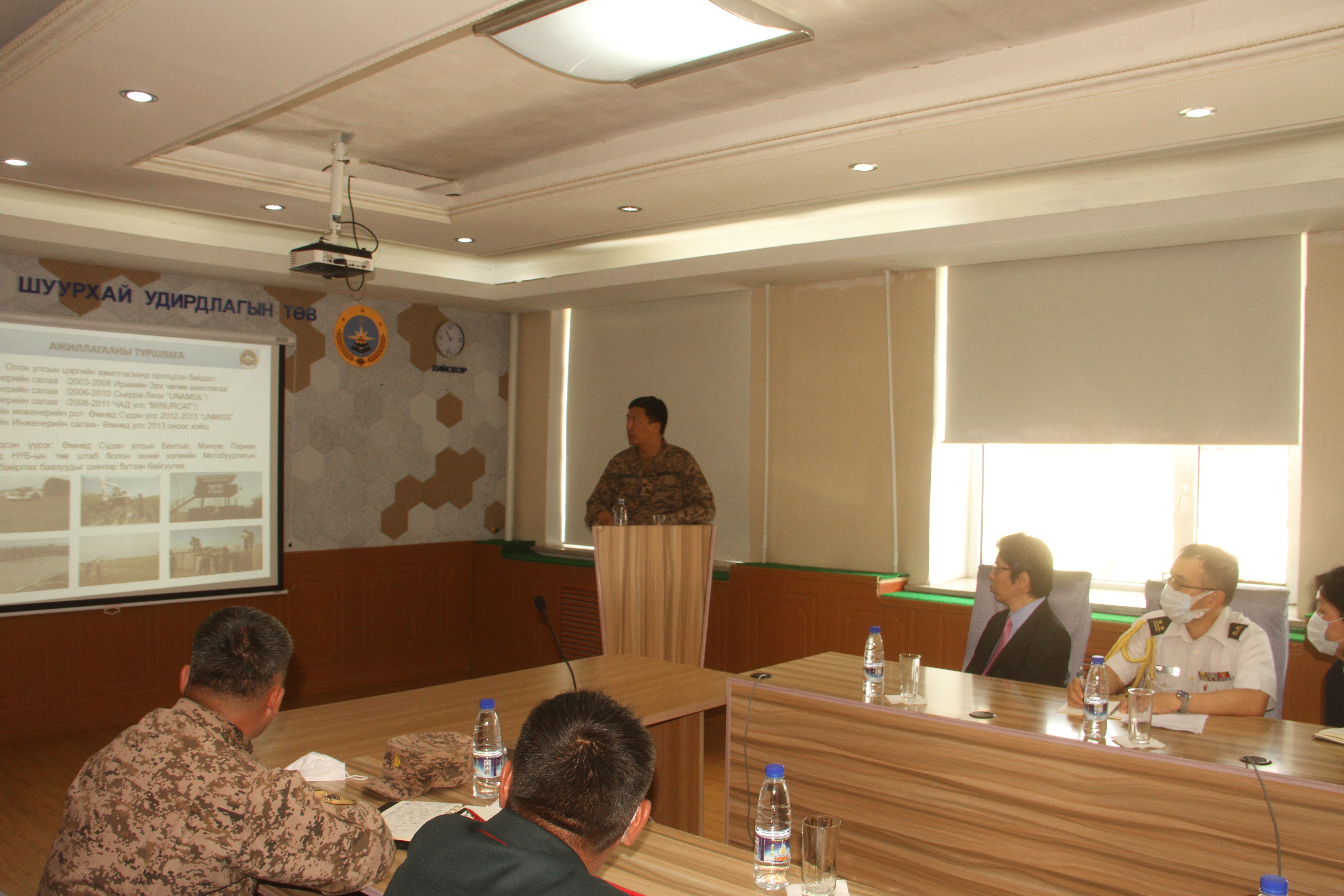 Хүндэт зочдыг Зэвсэгт хүчний Хуурай замын цэргийн командлалын Инженерийн дарга хурандаа С.Содов, ангийн удирдлагын хамт угтан авч, захирагчийн нэгдүгээр орлогч, штабын дарга хошууч Г.Мөнхбат үйл ажиллагаагаа танилцууллаа.