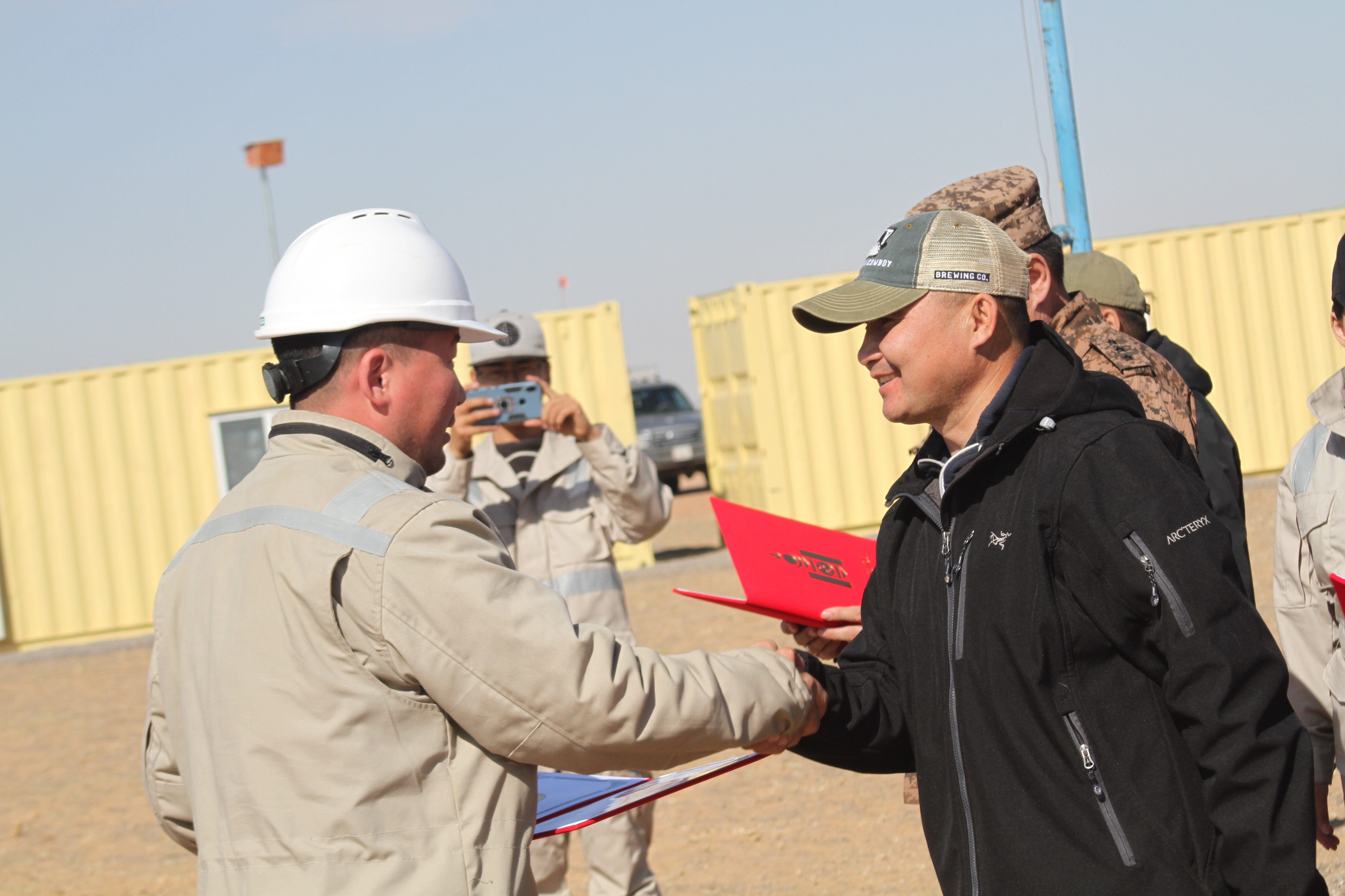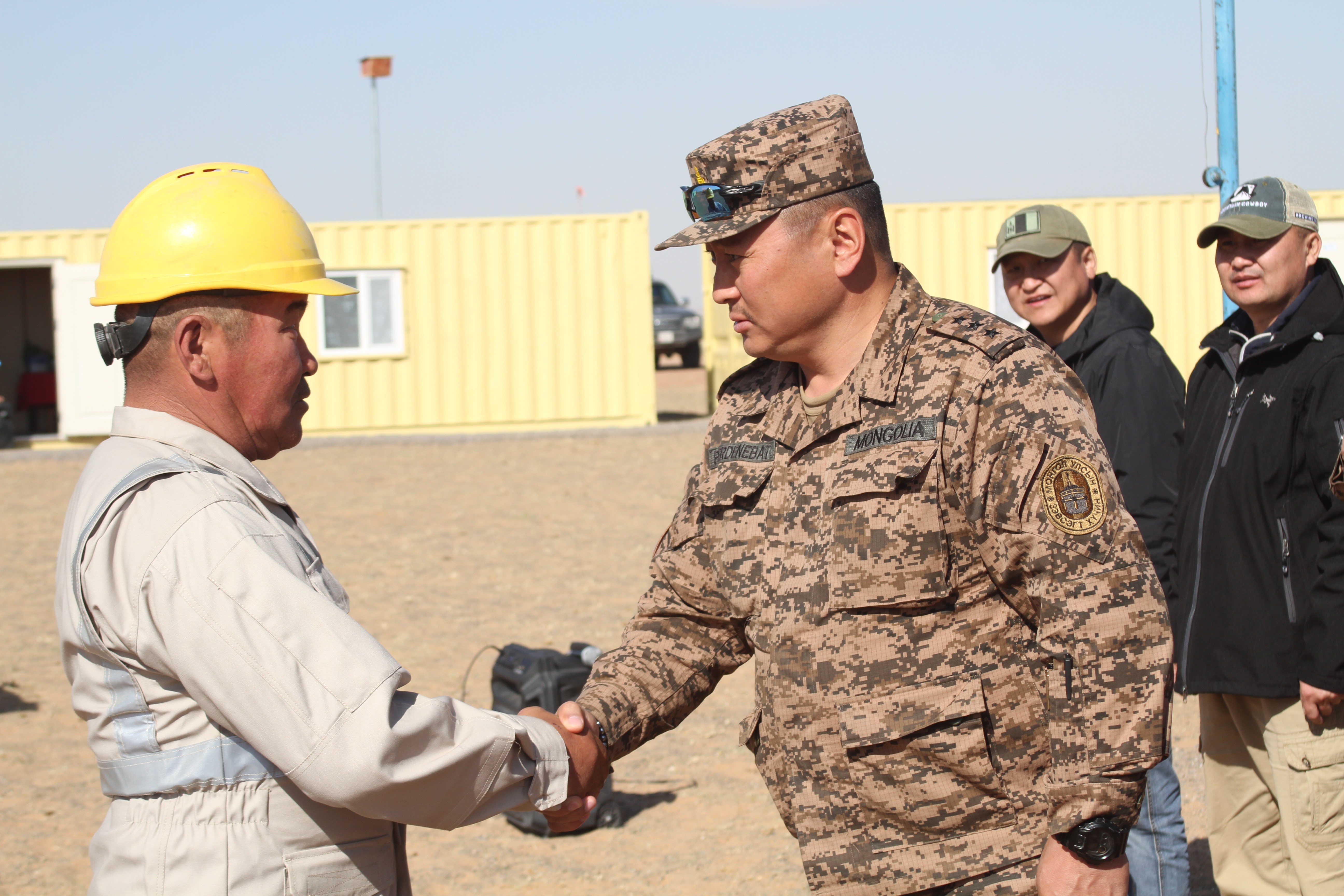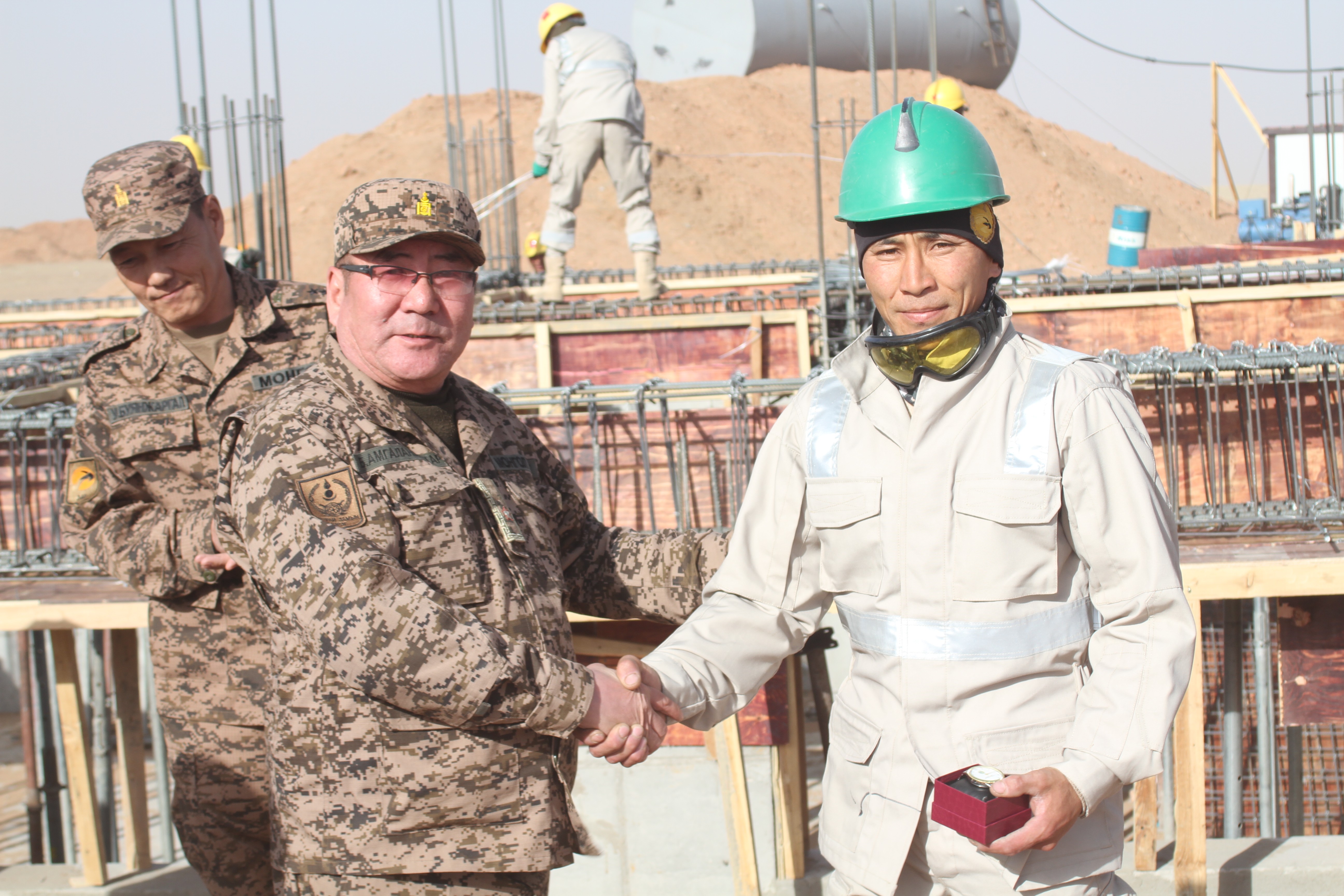 Саяхандаа л цэлийсэн талд өвс ногоо, шарилжнаас өөр бөртийх бараагүй байсан газарт бүхэл бүтэн барилгууд, төмөр замын далангийн ажил цаг хугацаатай уралдан “ургасан” юм шиг өндийн боссон байх нь бахтай гэж жигтэйхэн. Хүч, хөдөлмөрөөр нь өндийн босохыг харж урамшсан залуус улам л урам зоригтойгоор ажиллах дүр зураглал энэ талд л дүүрэн байна. Зэвсэгт хүчний 9 ангийн барилгачин дайчид, зарим хувийн хэвшлийн аж ахуйн нэгжийн хамтаар Дорноговь аймгийн Зүүнбаян сумаас Өмнөговь аймгийн Цогтцэций сум хүртэлх 414.6 км төмөр замын суурь бүтэц болоод зарим барилгын ажлыг бэлэн болгохоор өдөр, шөнө гэж ялгалгүй ажиллаж байгаа нь энэ. Төмөр замын суурь бүтцээс гадна дээд бүтцийн ажил ч зэрэгцээд “буцалж” байна. “Улаанбаатар төмөр зам” ХНН-ийн ажилчид Зүүнбаян өртөөнөөс эхлүүлэн галт тэрэг явах 22.5 км рейльс төмрийг угсарсан байв. Тал нутагт бүтээн байгуулалтыг сүндэрлүүлж байгаа цэргийнхнийгээ эргэх ЗХЖШ-ын даргын тушаалын дагуу Зэвсэгт хүчний Хуурай замын цэргийн командлагч, бригадын генерал Б.Амгаланбаатараар ахлуулсан тус командлалын тодорхой бүрэлдэхүүн тэдний хийж бүтээснийг нь харж бахархаж, омогшив. Бас хайрлав. ЗХЖШ-ын ахлагч, тэргүүн ахлагч Б.Гантөмөрөөр ахлуулсан ХЗЦК, АЦК, харьяа нэгтгэл, ангиудын тэргүүн ахлагч нар ч мөн адил бүтээн байгуулалтын явцтай танилцаж, журмын нөхдөөрөө бахдав. Хүмүүс байгалийн үзэсгэлэнг харж биширдэг дээ. Яг түүн шиг л хүн, техник хоёрын гараар бүтсэн бүтээн байгуулалтыг биширч явцгаав.