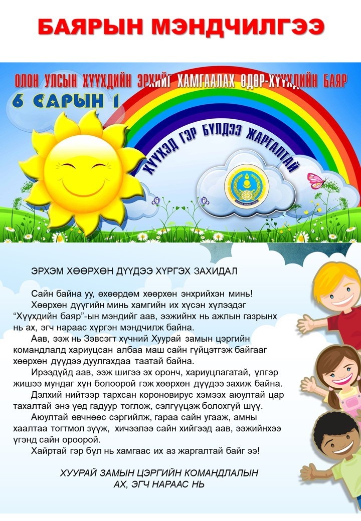 “Олон улсын хүүхдийн эрхийг хамгаалах өдөр” ирэх даваа гаригт тохиож байгаа билээ. Энэхүү өдрийг тохиолдуулан Зэвсэгт хүчний Хуурай замын цэргийн командлалаас бие бүрэлдэхүүнийхээ бяцхан багачуудад бэлэг илгээснээ өнөөдөр эцэг, эхчүүдэд нь гардуулан өглөө. Хуурай замын цэргийн командлалаас жил бүрийн энэ өдрүүдэд бүрэлдэхүүнийхээ гэр бүл, үр хүүхдүүдийг хүлээн авч, хүндэтгэл үзүүлдэг ч энэ жил дэлхий нийтээр тархсан цар тахлын нөхцөл байдлын улмаас эцэг эхчүүдэд нь гарын бэлэг, захидлын хамт өгсөн юм. Ингэхдээ орон нутагт ажиллаж, амьдарч байгаа зарим алба хаагчийнхаа багачуудыг урьж оролцуулсан. Хуурай замын цэргийн командлагчаас ажилтан алба хаагчдынхаа бяцхан багачуудад илгээсэн гарын бэлгийг Удирдлага, төлөвлөлтийн хэлтсийн дарга, хурандаа О.Эрдэнэбаатар, Хүний нөөцийн хэлтсийн дарга, хурандаа Д.Энхсайхан нар гардуулан өгч, айл бүр аз жаргалтай, үр хүүхдүүд нь эрүүл энх байж, инээд хөөрөөр цалгиж байхыг ерөөсөн юм.